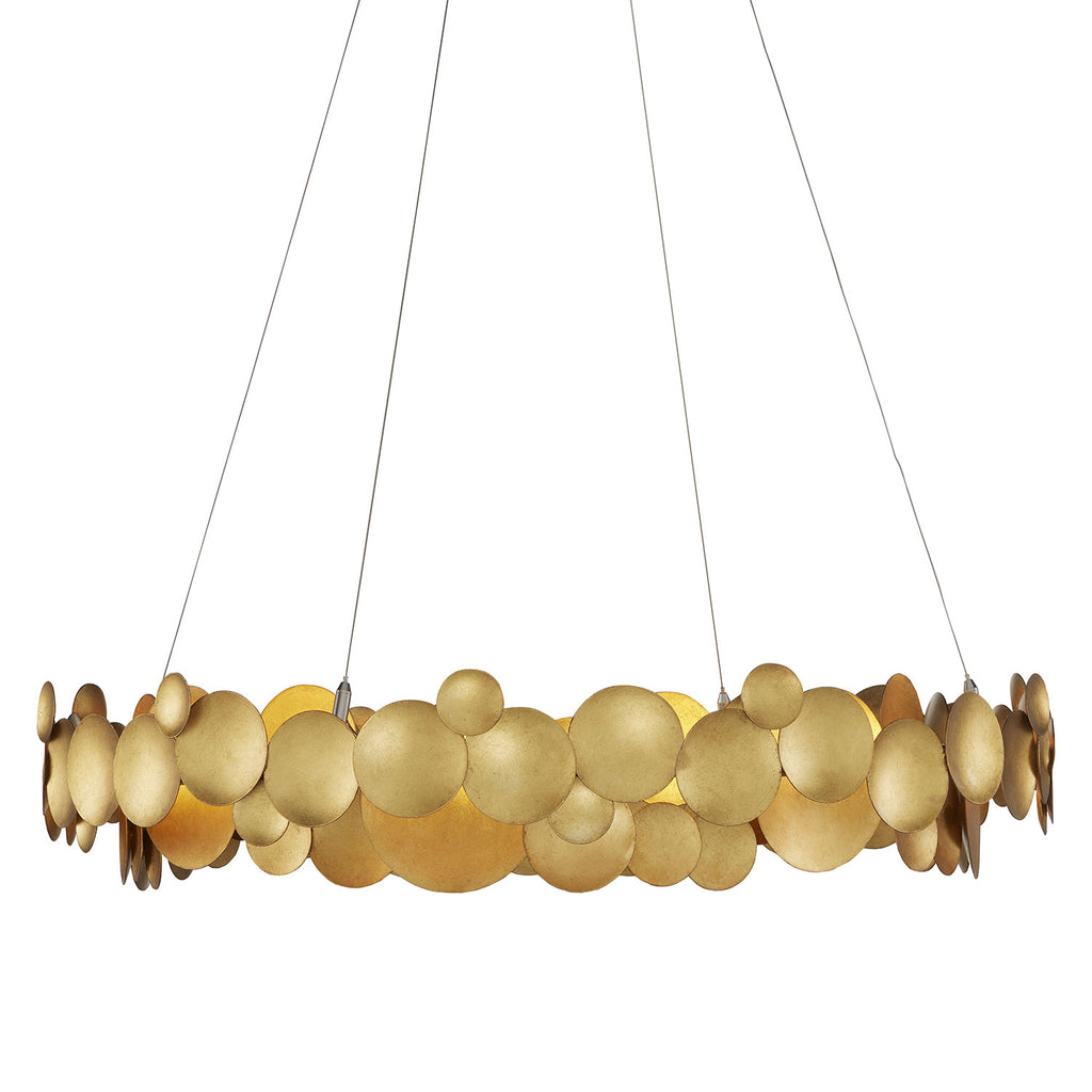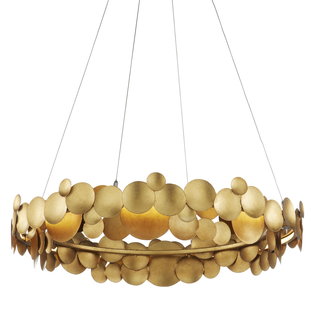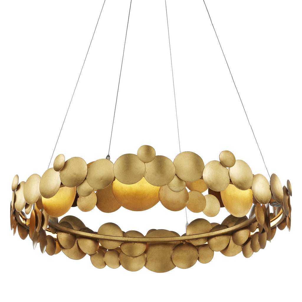 The Currey & Co Lavengro Chandelier is a layered design with a tremendous amount of charm. Wrought-iron discs in varying sizes are stacked in meandering patterns to make up the shade. The contemporary gold leaf finish on the discs and the central bar to which these are fastened gleam warmly whether the lights are switched on or not. This modern design by Clarence Mallari is innovative, as well, as it is lit by integrated LED technology.