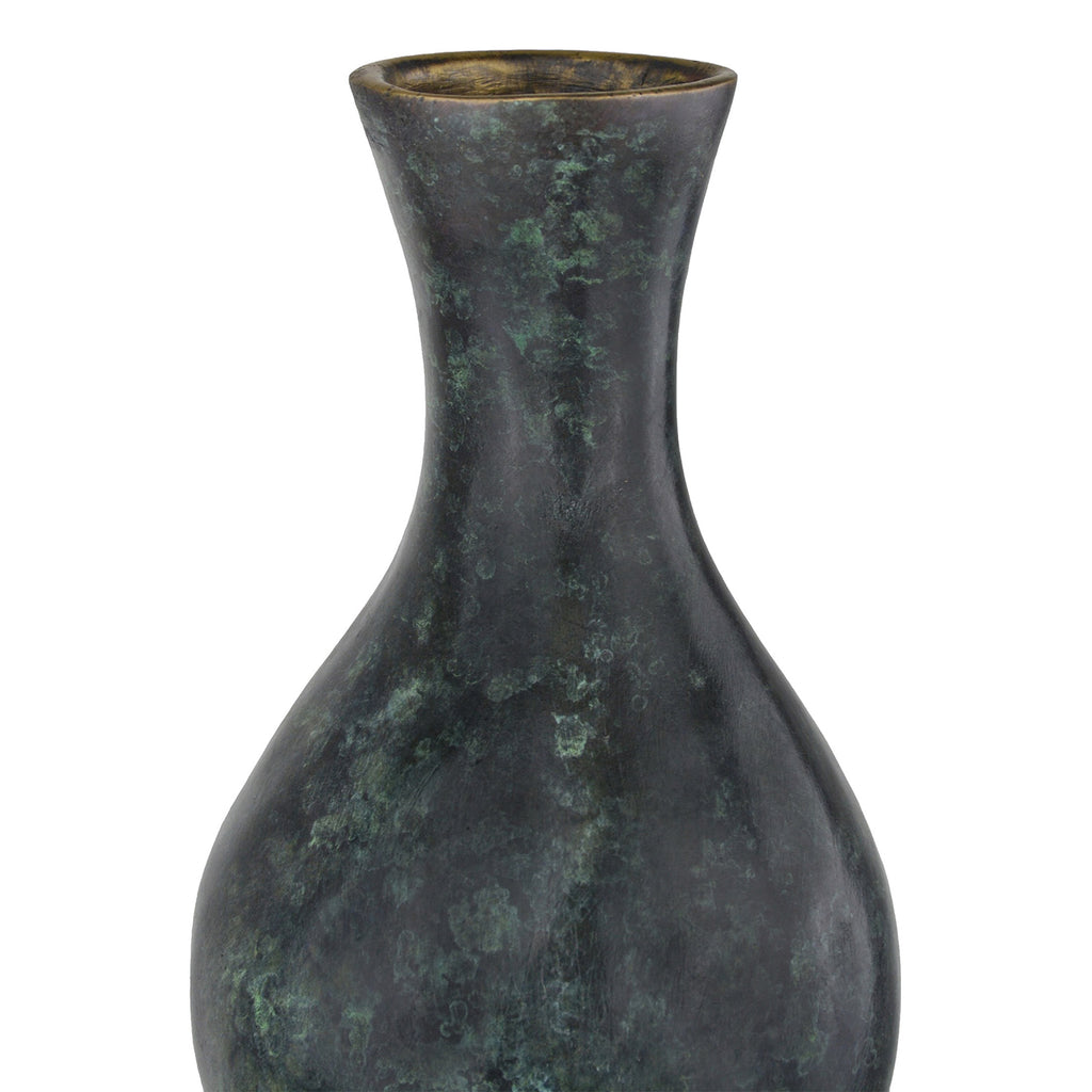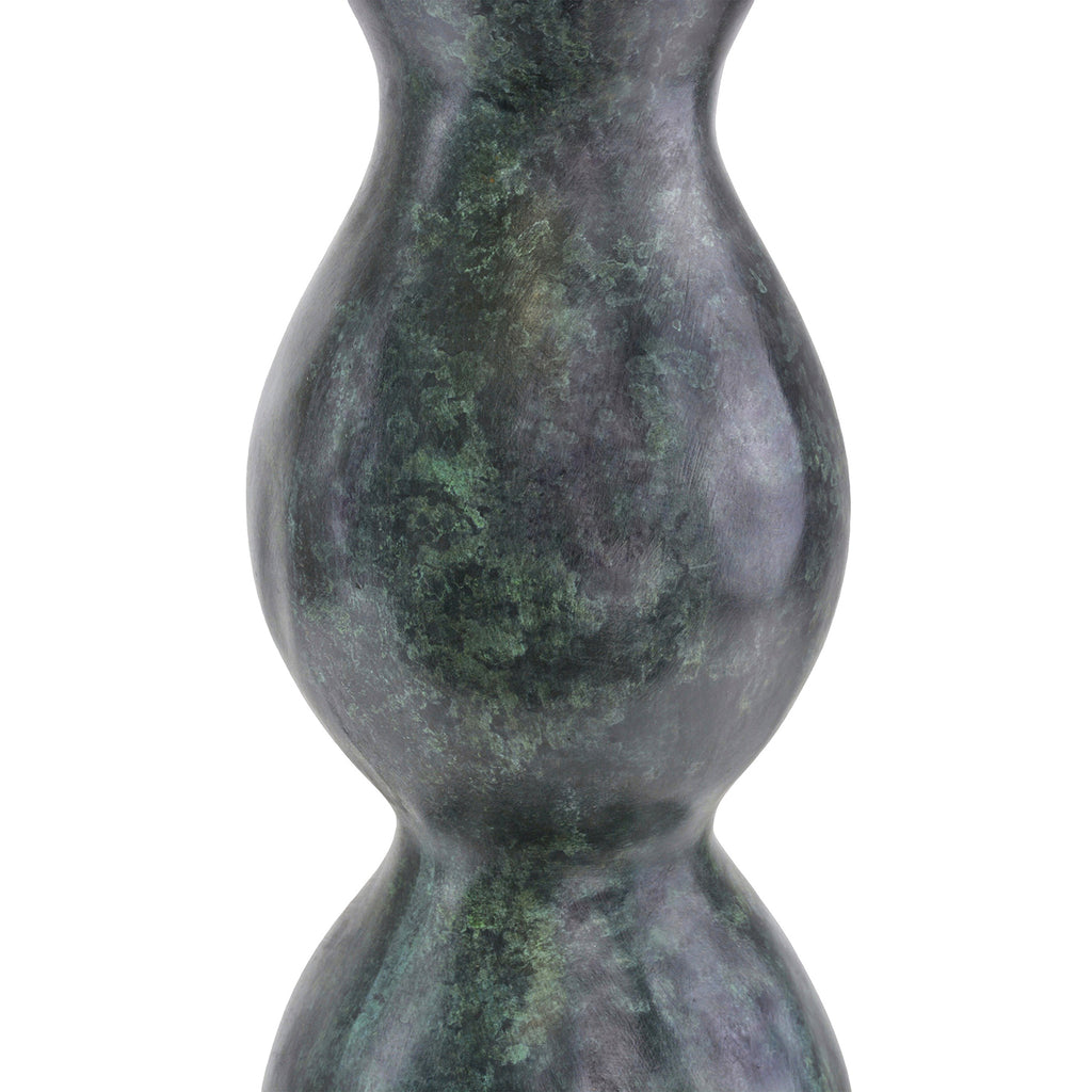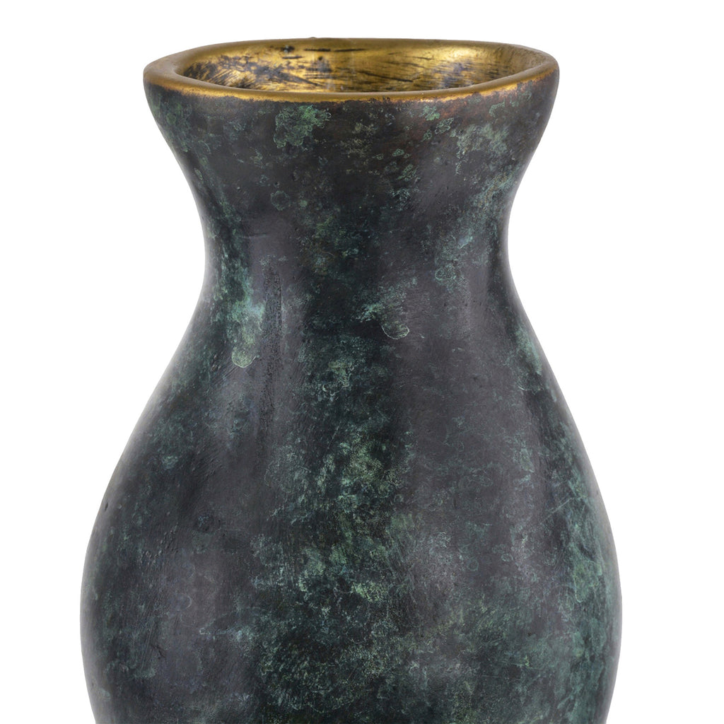 The Currey & Co Luganzo Small Bronze Vase has the undulant character of turned wood, but the sculpture is made of bronze with a jade green patina. A polished gold ring defines the culmination of its neck for a hint of sheen. The incredible distressing the artisans achieved with this vase after it has emerged during a lost-wax technique makes it a stunning textural piece that will read like an antique totemic accessory.