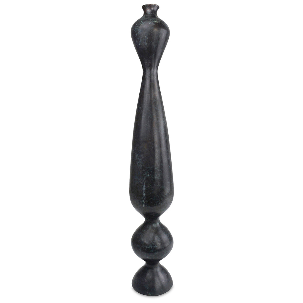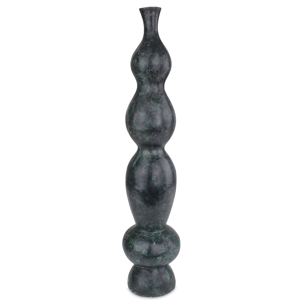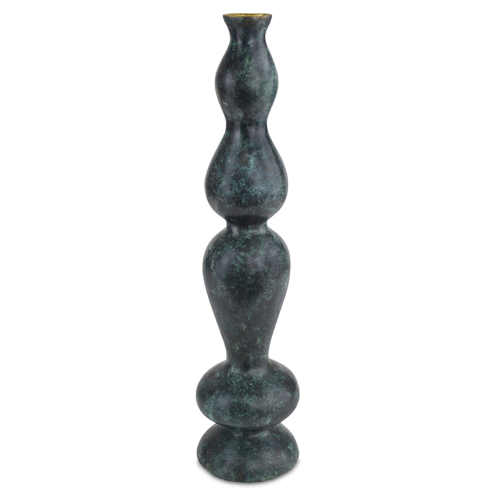 The Currey & Co Luganzo Small Bronze Vase has the undulant character of turned wood, but the sculpture is made of bronze with a jade green patina. A polished gold ring defines the culmination of its neck for a hint of sheen. The incredible distressing the artisans achieved with this vase after it has emerged during a lost-wax technique makes it a stunning textural piece that will read like an antique totemic accessory.