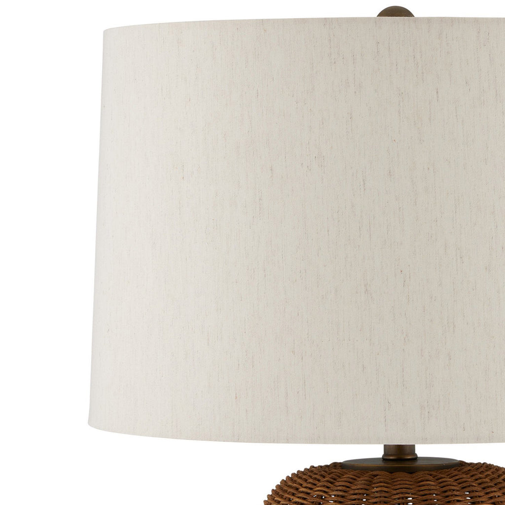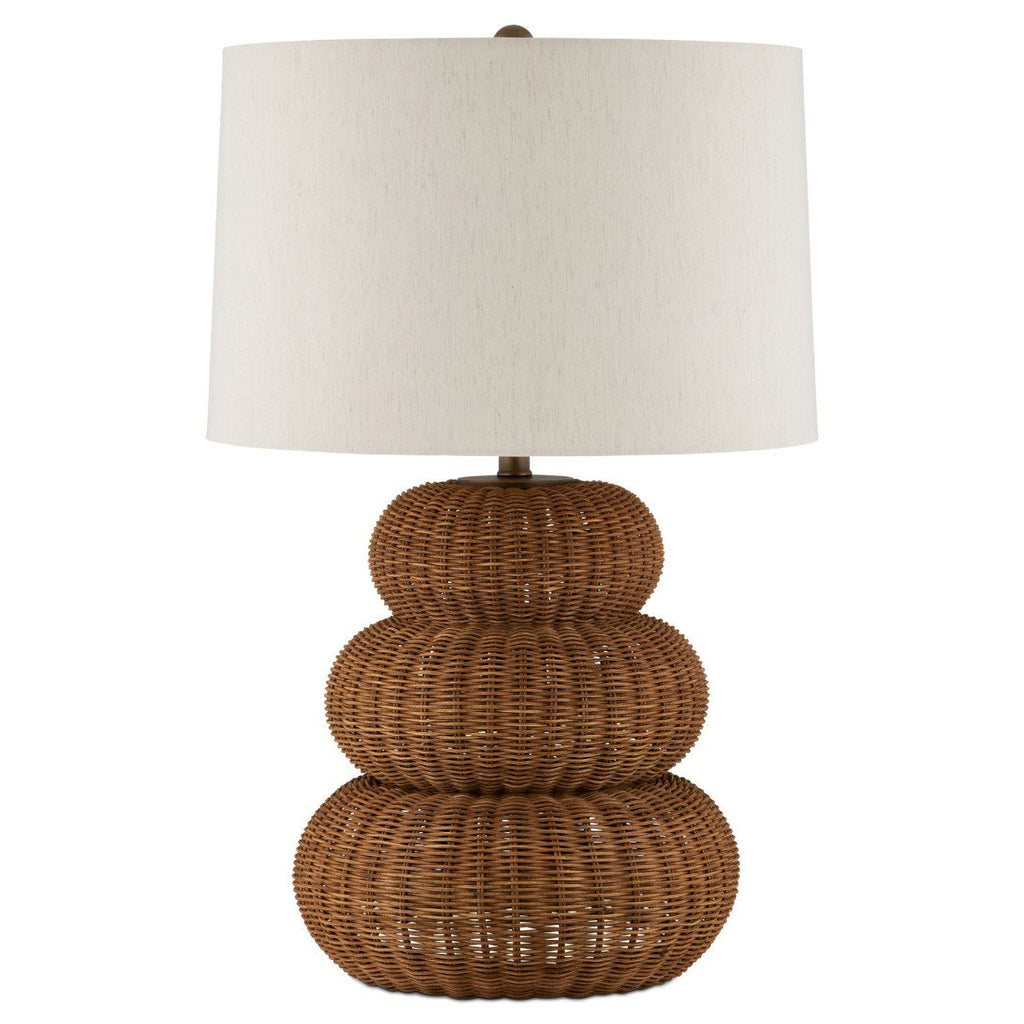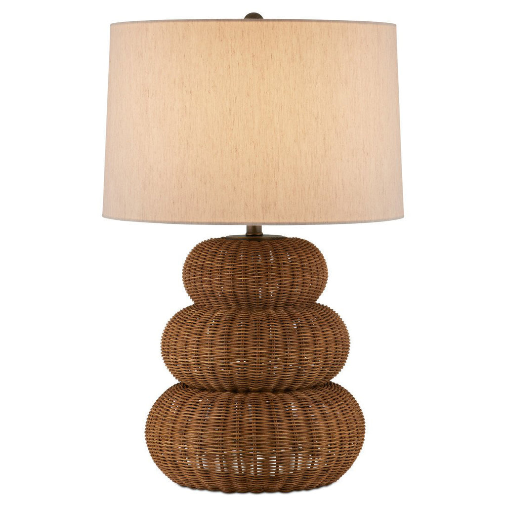 Nothing says texture in a space better than woven natural materials. The Mabrouka Table Lamp brings it in spades. Made of rattan, the triple-gourd shape of the lamp's body and the dark brown finish that adds warmth to the natural material enliven the personality of the brown lamp. The hardware and finial in an antique brass finish read as perfectly in-sync with the color of the wicker weave.