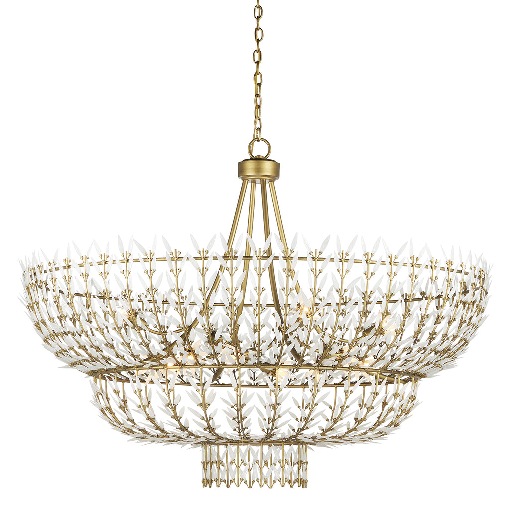 Tom Caldwell undertook the challenge of creating a clean-lined version of a vintage design when he meticulously conceived the Magnum Opus Large Chandelier. The rows of glass leaves attached to the three-tier arcing metal stems effervesce with light, creating a stunning sculptural fixture. The white glass also beautifully contrasts the metal in a brass finish, the cool/warm contrast bringing the gold chandelier a heightened level of texture. The beautiful white glass leaves also surround the seven bulbs on this fixture to add extra texture and nuance. This is a grandly scaled chandelier at 54 inches in diameter.