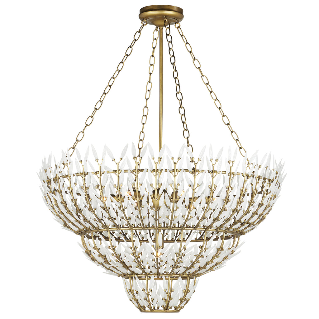The Magnum Opus Large Chandelier is a clean-lined version of a vintage design, meticulously conceived to bring elegance to any space. The rows of glass leaves attached to the three-tier metal stems effervesce when light strikes them to create a stunning sculptural fixture. The white glass also beautifully contrasts the metal in a brass finish, the cool/warm contrast bringing the gold chandelier a heightened level of texture. The beautiful white glass leaves also surround the seven bulbs on this fixture to infuse a space with a lovely glow. Adjustable from 48.5" to 116.5" with use of included chain/rod kit/cable. If your space calls for a longer drop, additional chain/rods/cable is available for purchase.