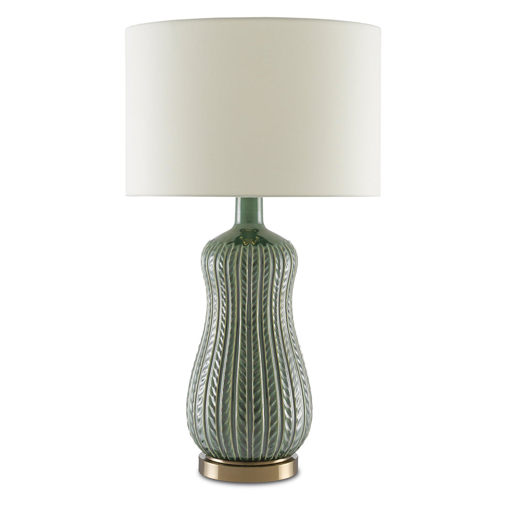 Knitting itself a perfect profile, the Currey & Company Mamora table lamp is made of ceramic with a pale or green glaze. This table lamp with its slight feminine feel perches atop a metal base. The texture in the natural linen shade perfectly complements the leafy trellis pattern that runs along the body of the peanut-shaped lamp.
