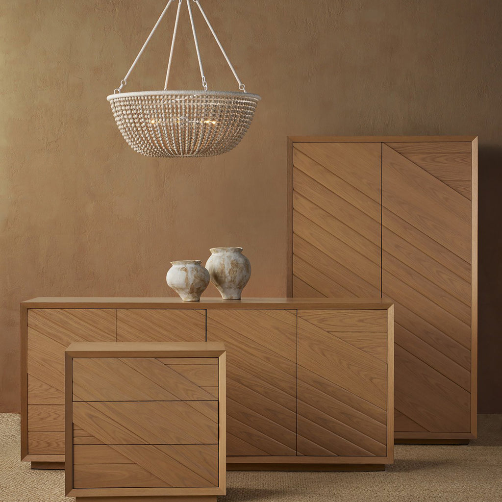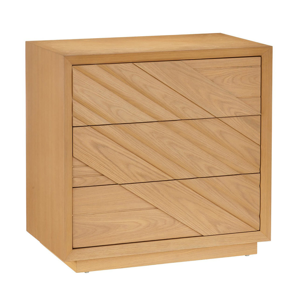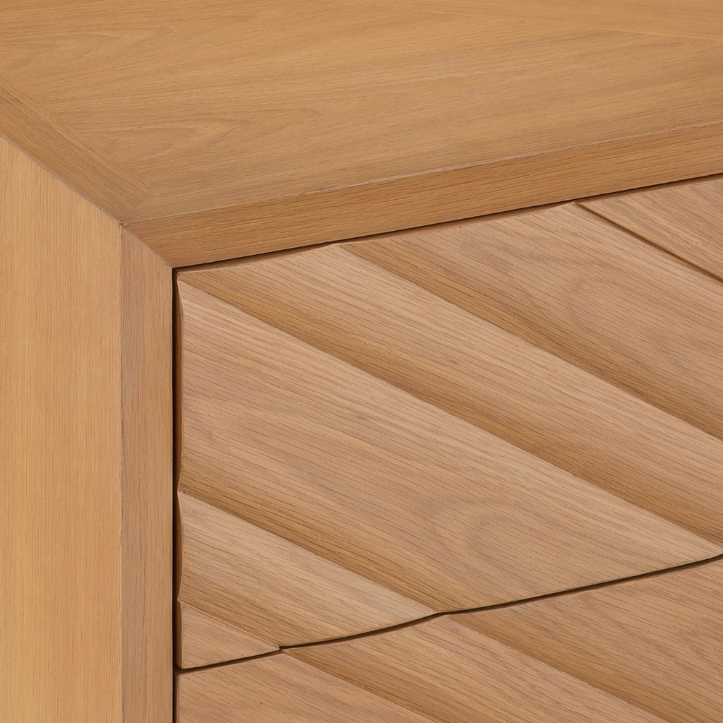 Made of white-oak solids and veneers in a light oak finish, the Currey & Co Margot Natural Oak Chest was inspired by the casual styleof California’s coastal communities. A number of outstanding features include a full chamfered profile edge on the face frame, and a multi-dimensional angled pattern on the drawers created with white oak crown veneers. There are generous-sized drawers with beige velvet liners, and the drawers are push to open and close.