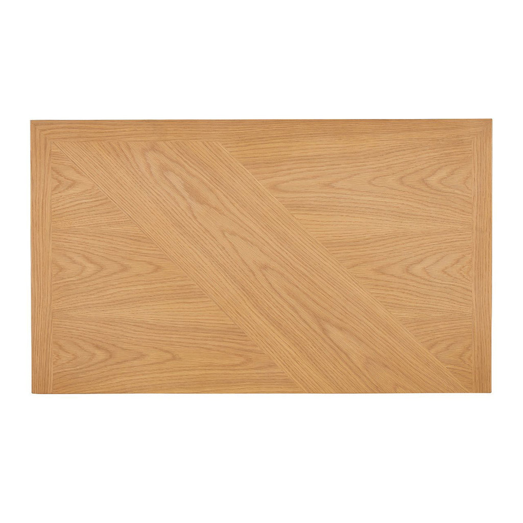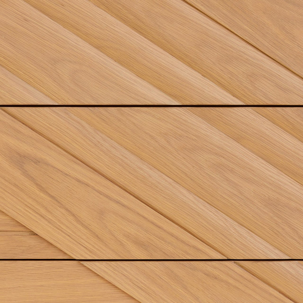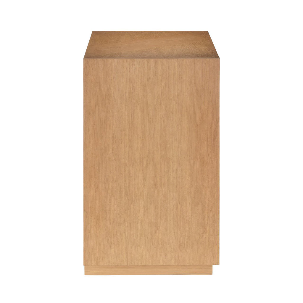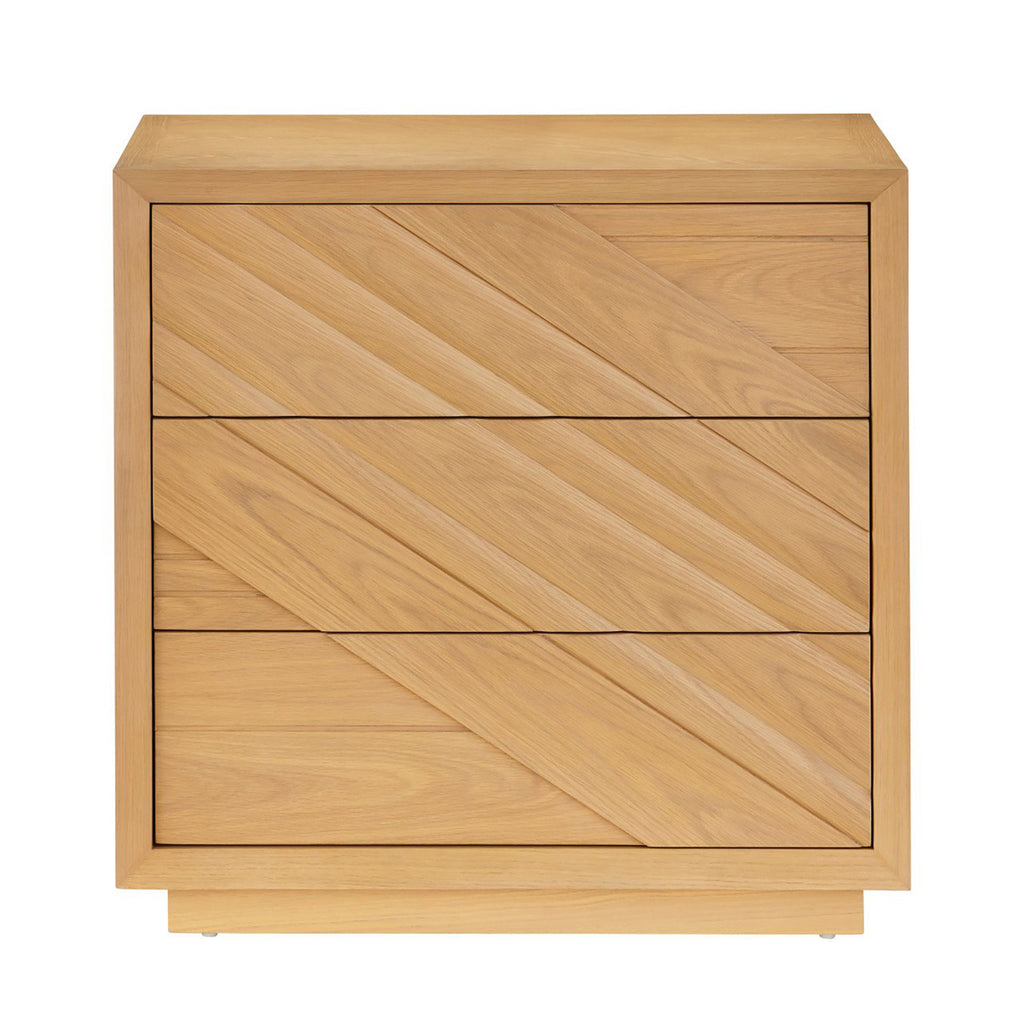 Made of white-oak solids and veneers in a light oak finish, the Currey & Co Margot Natural Oak Chest was inspired by the casual styleof California’s coastal communities. A number of outstanding features include a full chamfered profile edge on the face frame, and a multi-dimensional angled pattern on the drawers created with white oak crown veneers. There are generous-sized drawers with beige velvet liners, and the drawers are push to open and close.