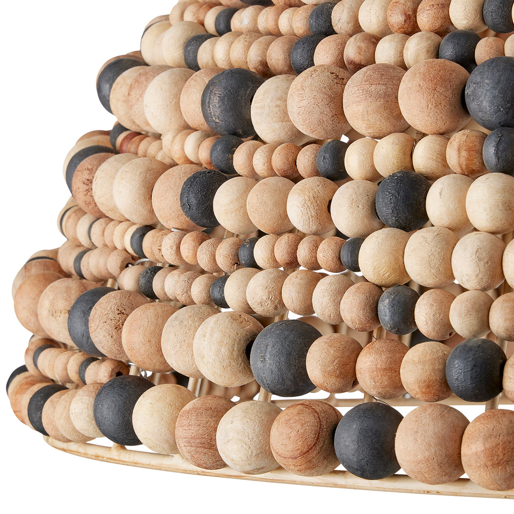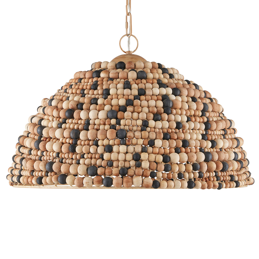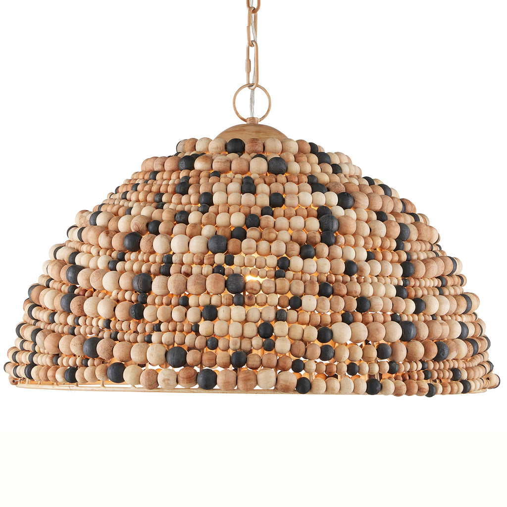 The Currey & Co Medley Pendant has an pebbly feel to its surface thanks to the wood beads that not only differ in size, but also in color -- natural, tan, and black. Clarence Mallari, who designed this dome-shaped pendant, notes how the wires are welded together to accommodate the different bead sizes and how the fixture looks beautiful when viewed from underneath.