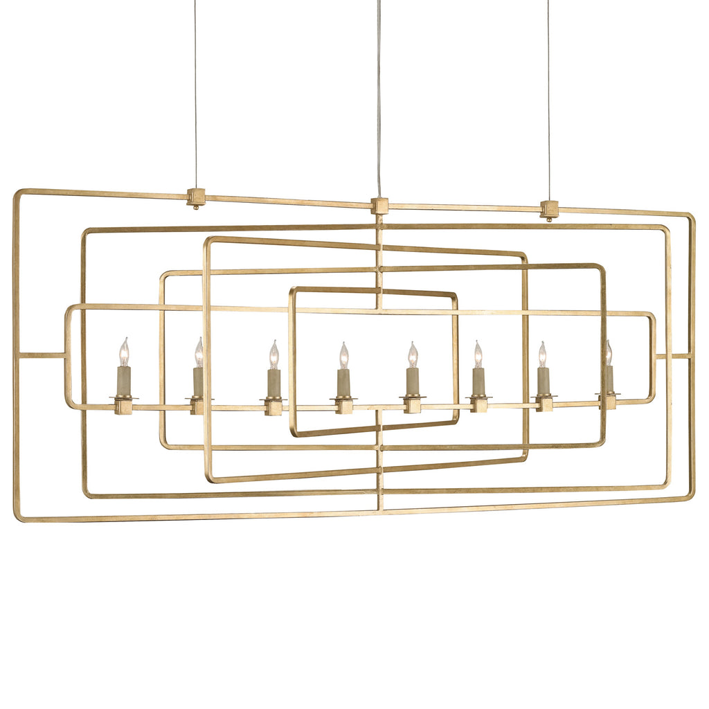 Think Paris International Style, which was all the rage in the 1930s, but with a contemporary new twist and you have a read on the Metro Rectangular Chandelier. The elongated linear shape and the interlocking rectangles of the wrought iron that create the frame is a nod to early modernism. The eight-light fixture has been treated to a rich contemporary gold leaf.