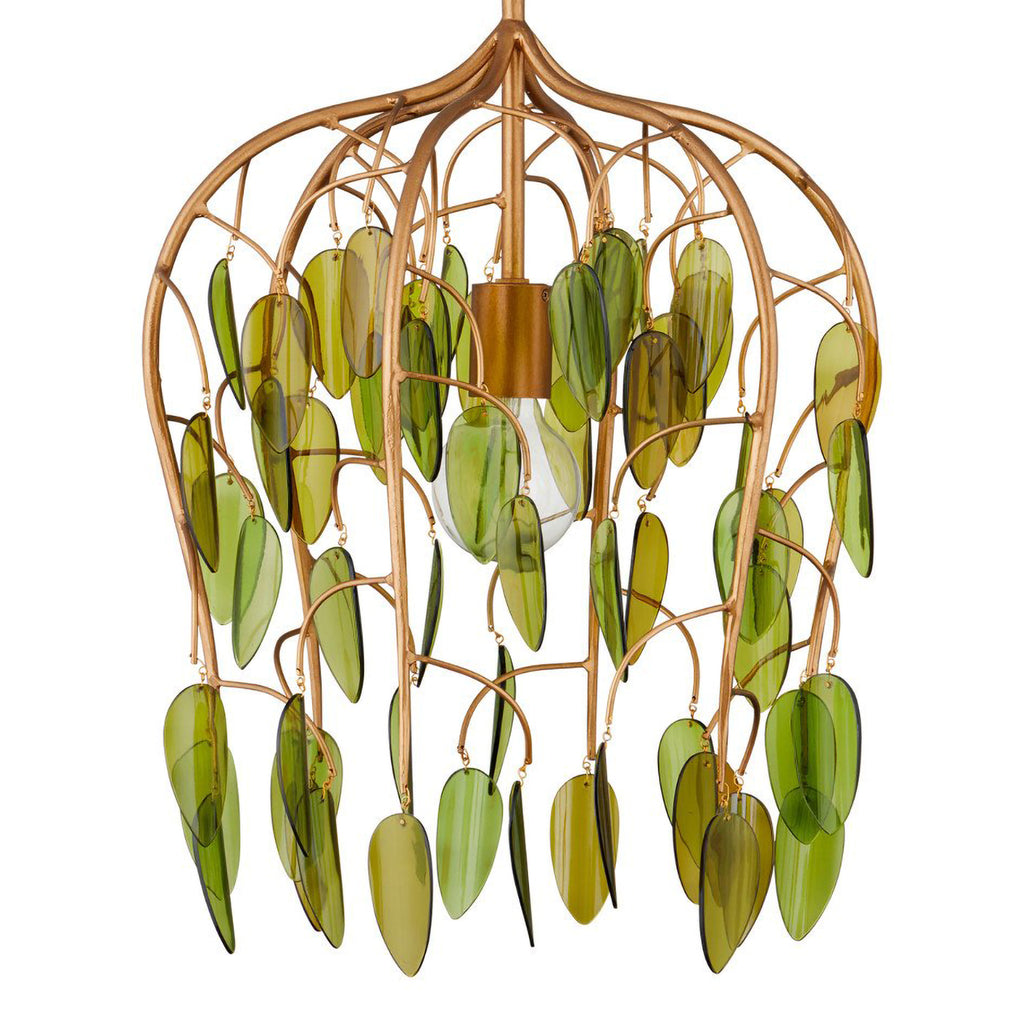 As lovely as a dangling blossom that calls to mind a balmy evening, the Midsummer Pendant blooms with artistry. A wrought iron frame that tapers from a clean-lined rod to thin tendrils as it graduates toward the bottom dangles curved petals made of recycled glass. The green and amber pieces retain the original colors of the beverage bottles from which they were taken. Because this fixture is artisanal, the configuration of the glass colors will vary slightly, which makes each green and gold pendant unique.