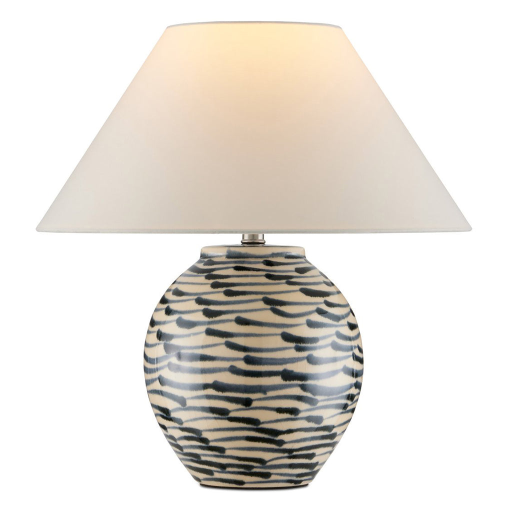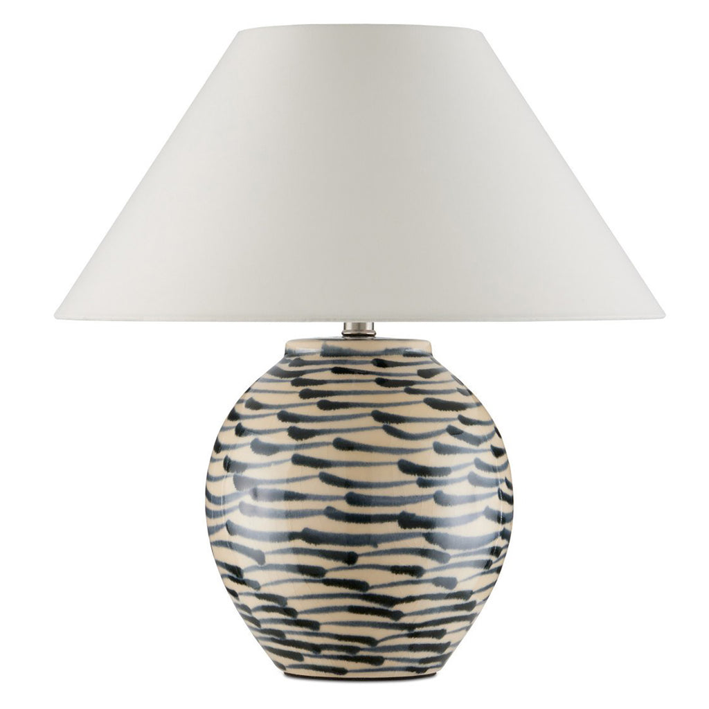 The Currey & Co Minnows Blue Table Lamp is swimming with personality, not merely from the streaking fish-like brush strokes on its ceramic surface, but from the crackle finish applied to the beige background beneath them. A flared empire shade adds to the Asian feel of this design. Because this lamp is hand-painted, the patterning will vary from piece to piece.