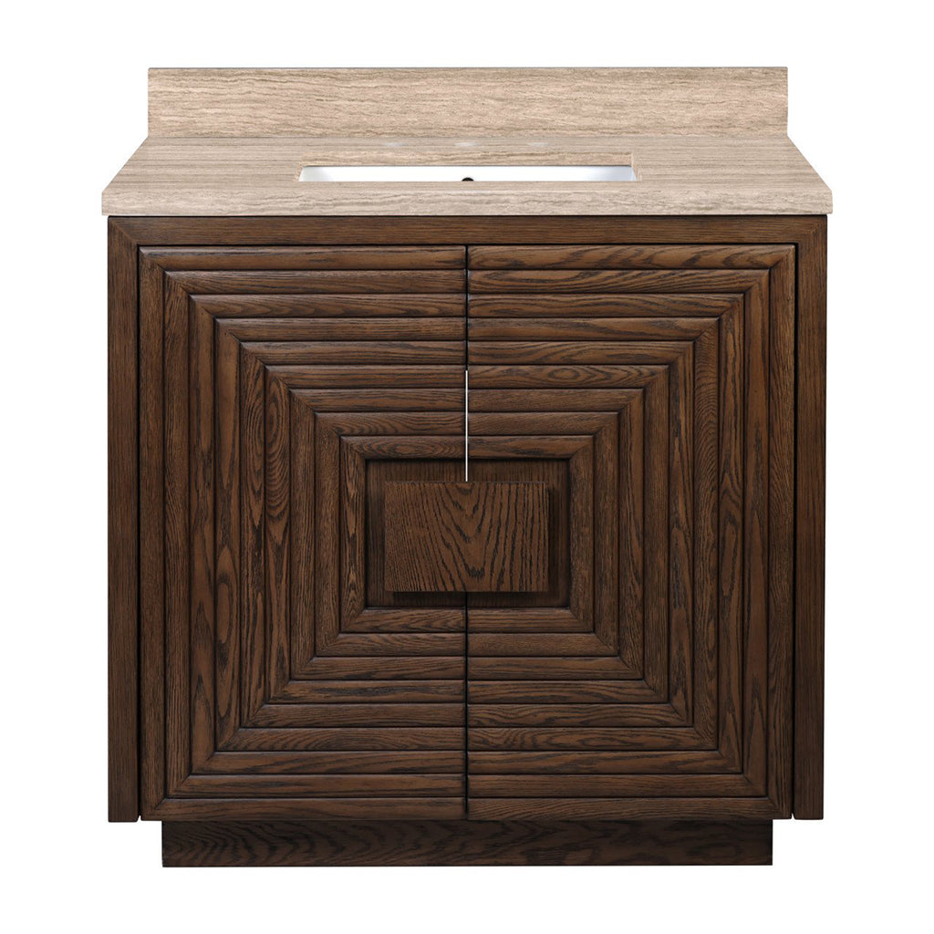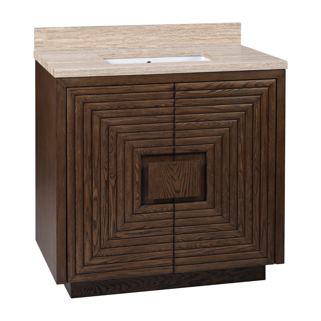 The deep-toned distressed cocoa finish on the Currey & Co Morombe 36" Cocoa Vanity highlights the patterns of natural wood that form embedded squares in a geometric illusion of depth. The interior has one adjustable shelf and there are two optional wood trays that attach to the inside of the doors. The travertine top is fitted with a rectangular undermount sink. Other fine design attributes include soft-close door hinges and a matching marble backsplash.