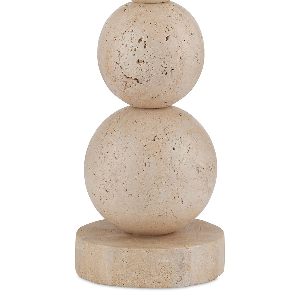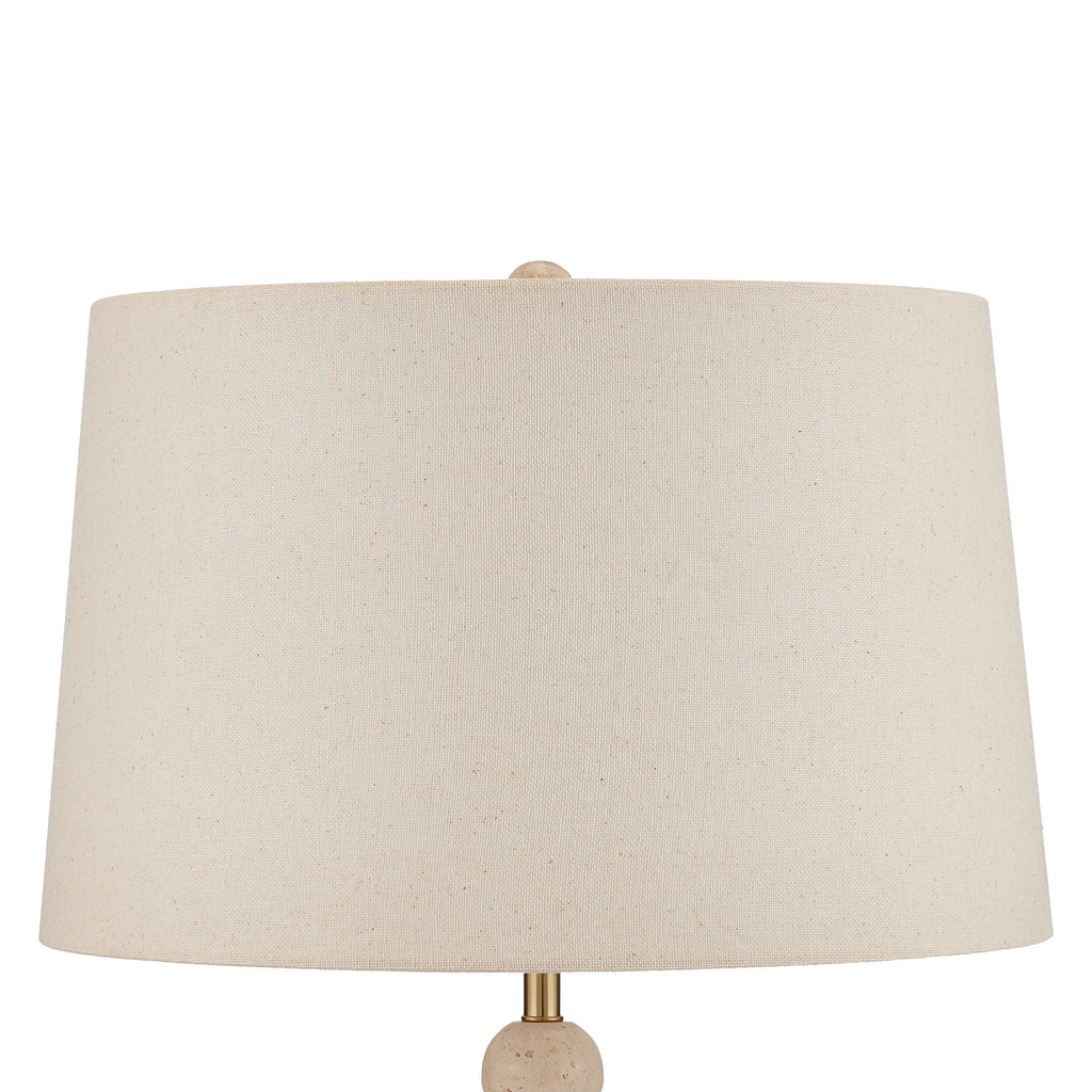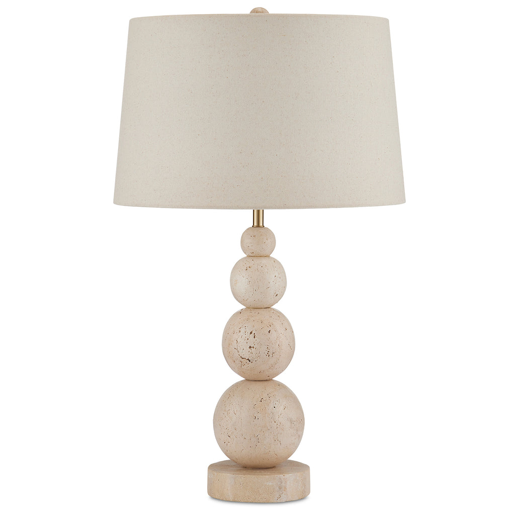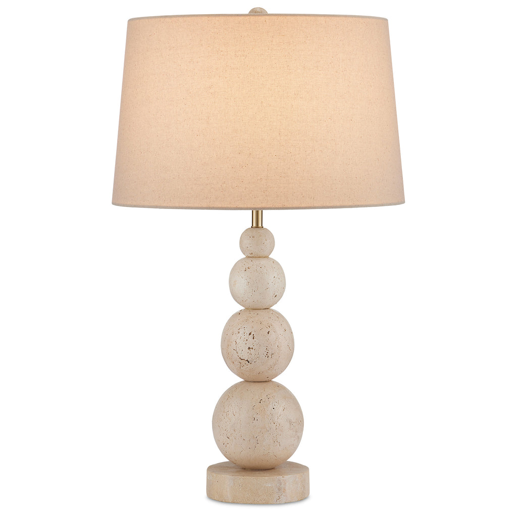 Made of natural travertine, the Currey & Co Niobe Table Lamp has a whimsical profile created by the graduating stacked balls that rise from a disc base of the same material. The texture of the beige lamp is enhanced by the flecks in the flax linen shade. Because this beige lamp is made of natural stone, texture and color may vary from lamp to lamp.