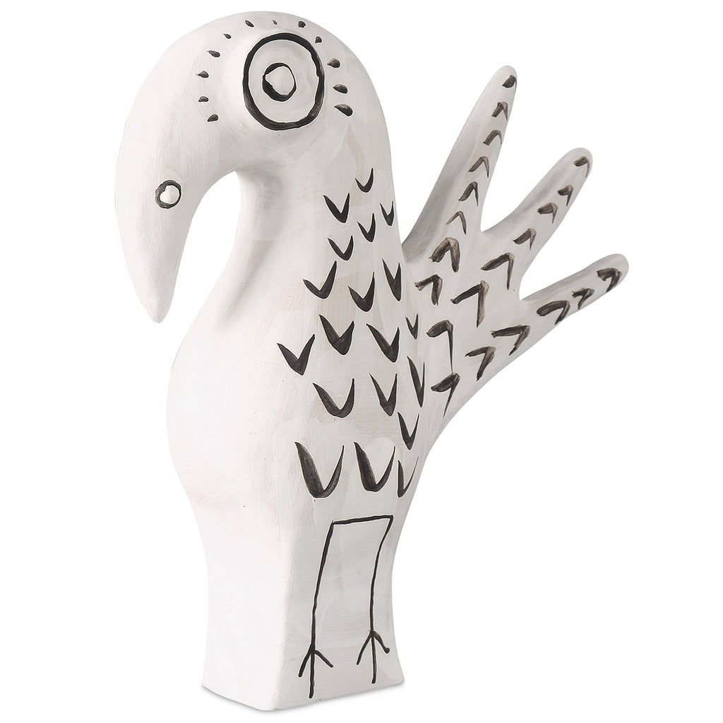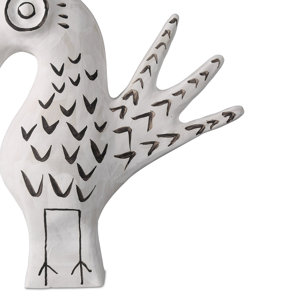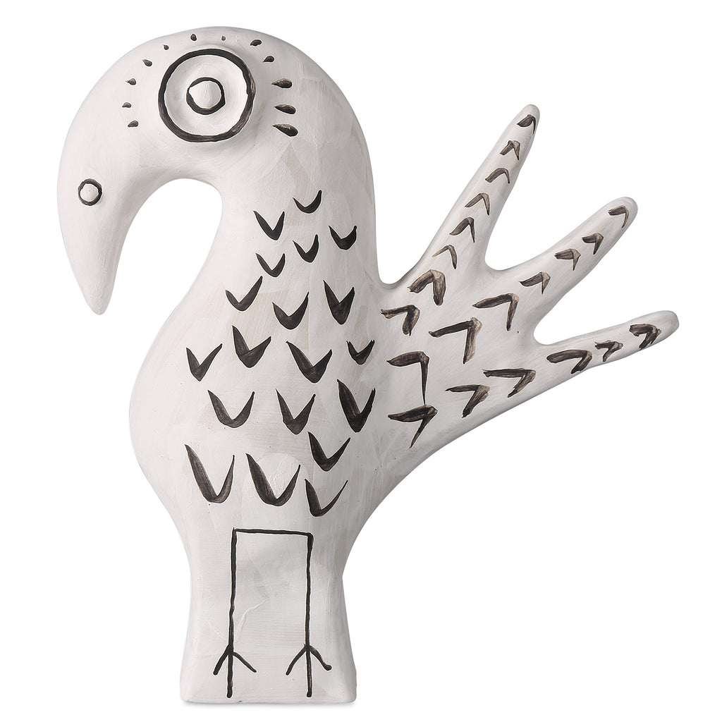 Artist Xiang Yang, a brilliant ceramist, took a walk on the wild side when he created Currey & Co Norman the Peacock. Made of porcelain in a washed-white finish with black whimsical details painted by the artist, the haunting vessel will create a stir not unlike Picasso's work did during his ceramics period as he experimented in the South of France.