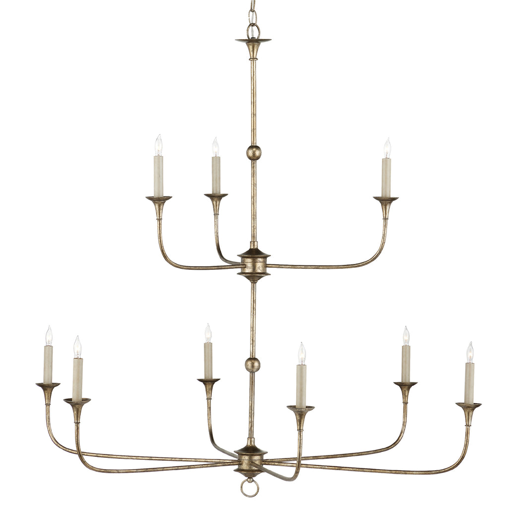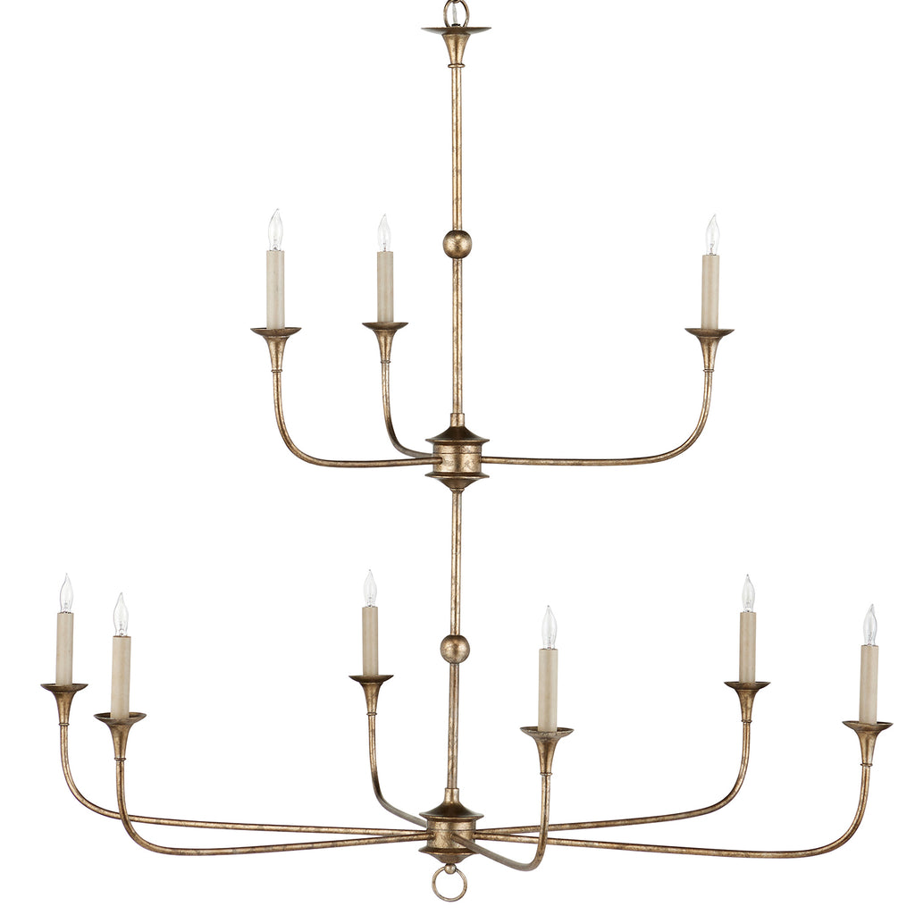 Design notes on the Nottaway Two-Tier Bronze Chandelier include long arms that stretch gracefully from small cogs and a ring that ornaments its bottom-most point. The profile of the fixture has a lovely fluidity to it, and the Pyrite bronze finish adds textural interest to the bronze chandelier. This statuesque chandelier is decidedly in the traditional design category, but its airiness allows it to function in a range of large rooms. Adjustable from 51" to 119" with use of included chain/rod kit/cable. If your space calls for a longer drop, additional chain/rods/cable is available for purchase.