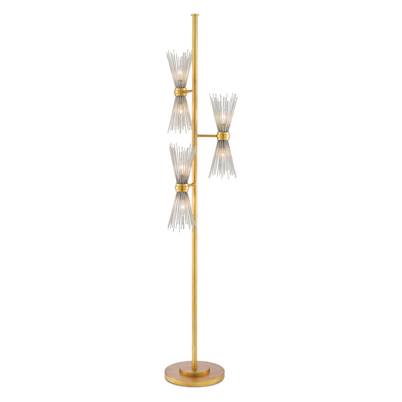 Exploding from articulated clasps, the shades of our Novatude Floor Lamp effervesce like spritzing stars. What makes this design dramatically beautiful is that the entire composition is made of wrought iron, even the thin ribs that make up the shades. The body and clasps of this piece have been treated to an antique gold leaf finish, while the spikes covering the bulbs are in a gleaming contemporary silver leaf finish.