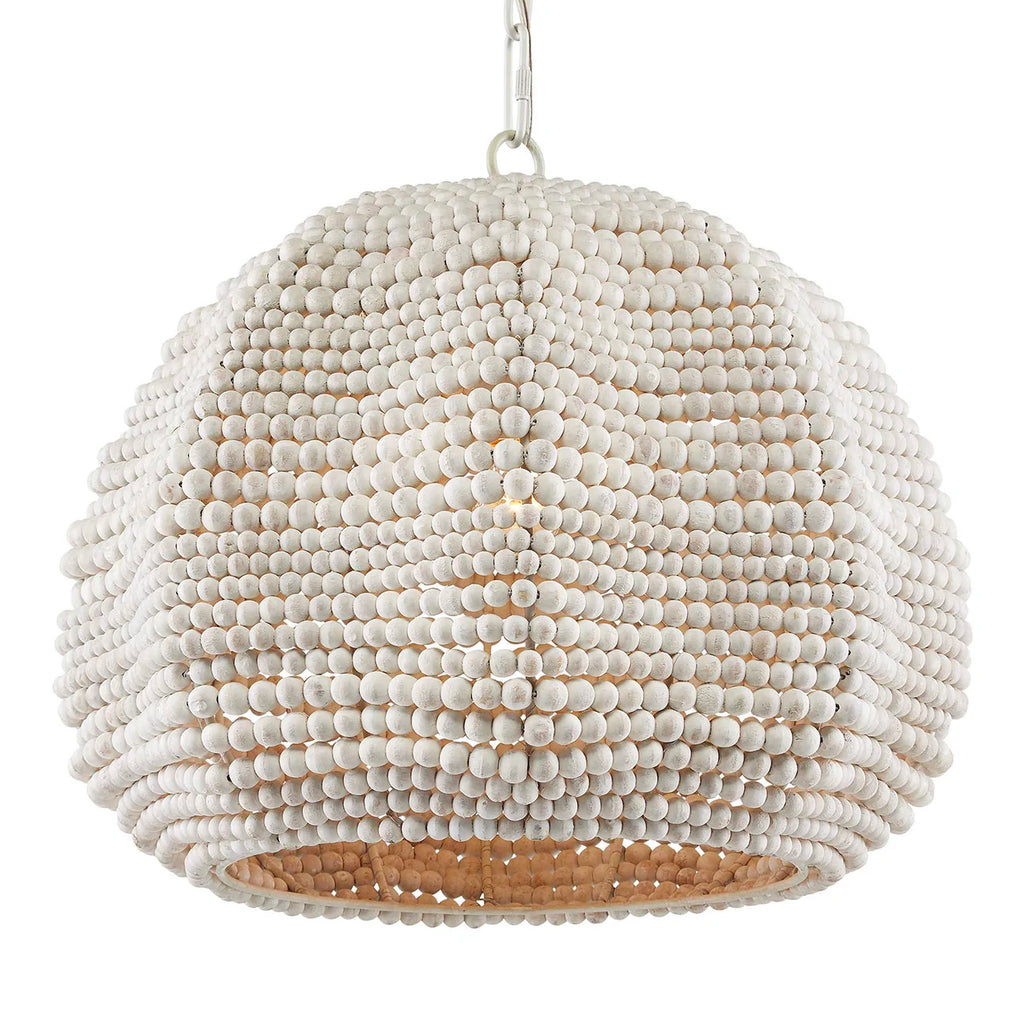 The Currey & Co Octavia Pendant has a flowing profile made of wood beads that have been whitewashed and strung along metal wire so that the shape will remain whimsical. This white pendant fits perfectly within the coastal design aesthetic that is sought after for interiors. The desire for casual elements that hold up to the highest design standards is driving this movement.