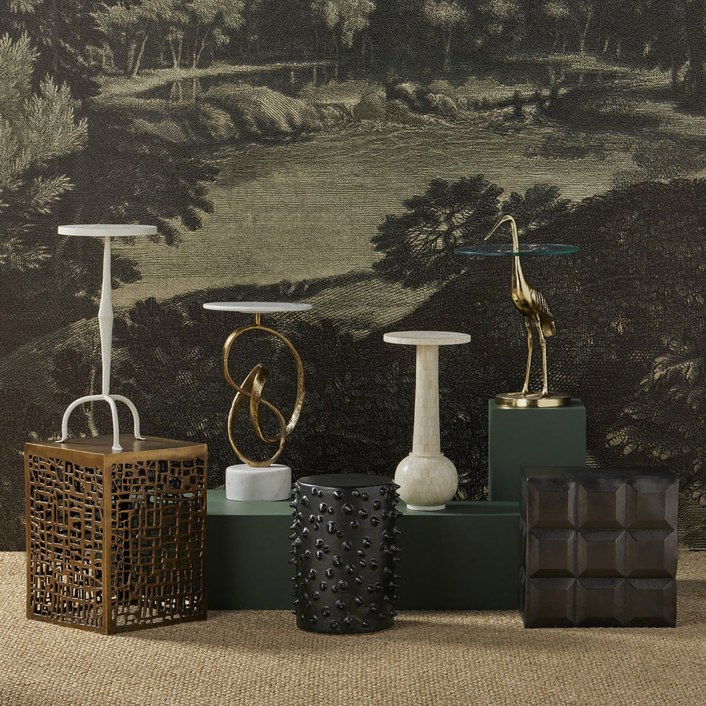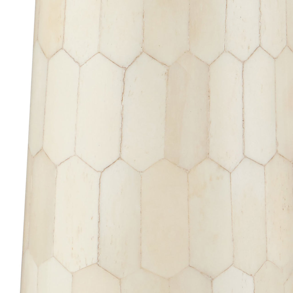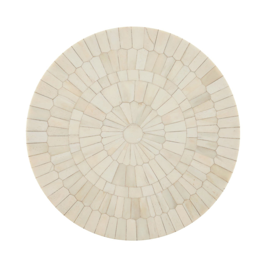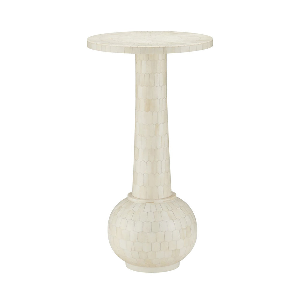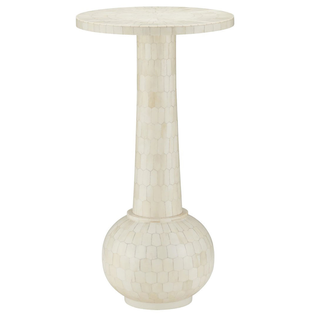 The Currey & Co Osa Drinks Table is a work of art, with its surface covered in over 400 pieces of natural bone that were ground into picket-tile shapes before being applied. The precision required to place the pieces so perfectly is a painstaking process. The plinth base on which the ivory drinks table sits is also covered in bone.