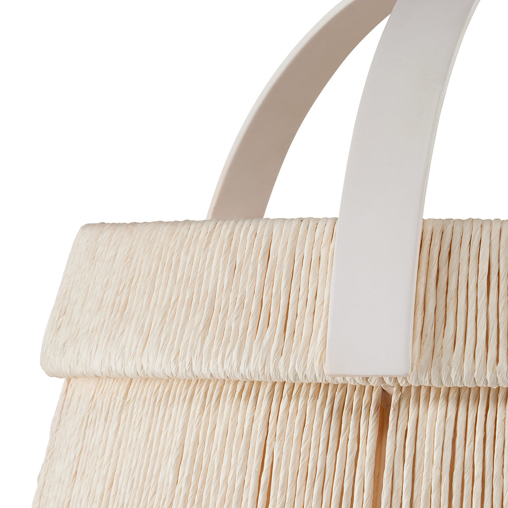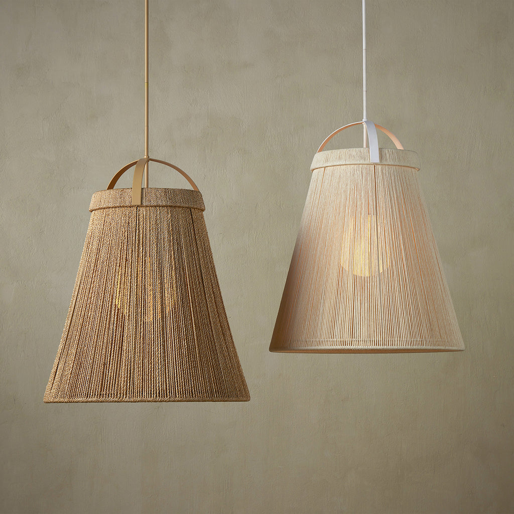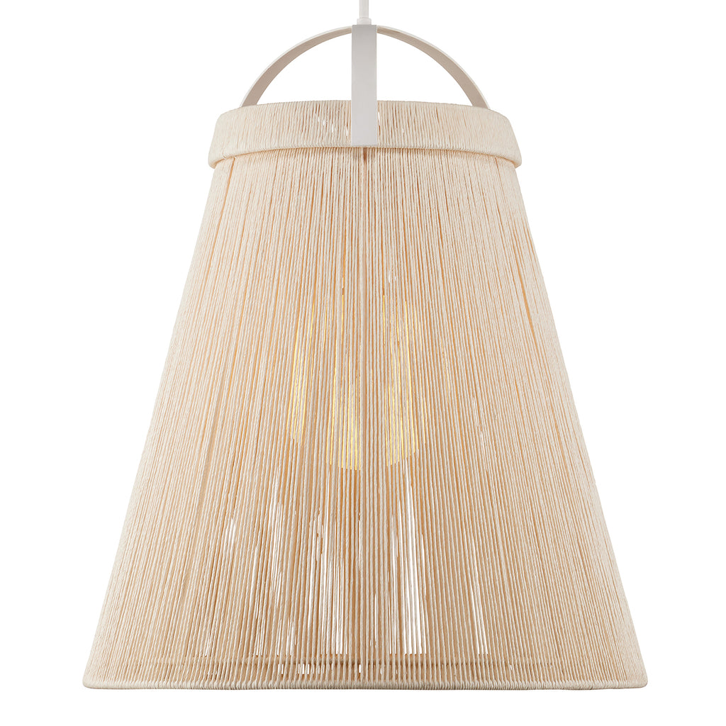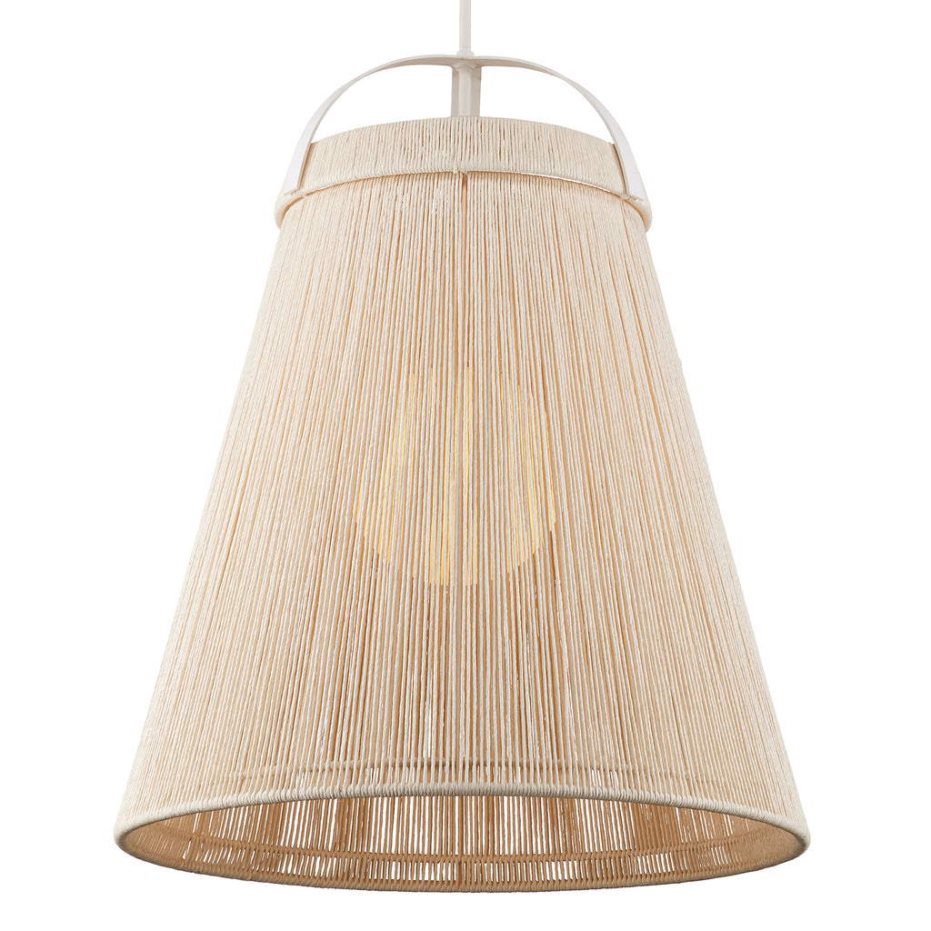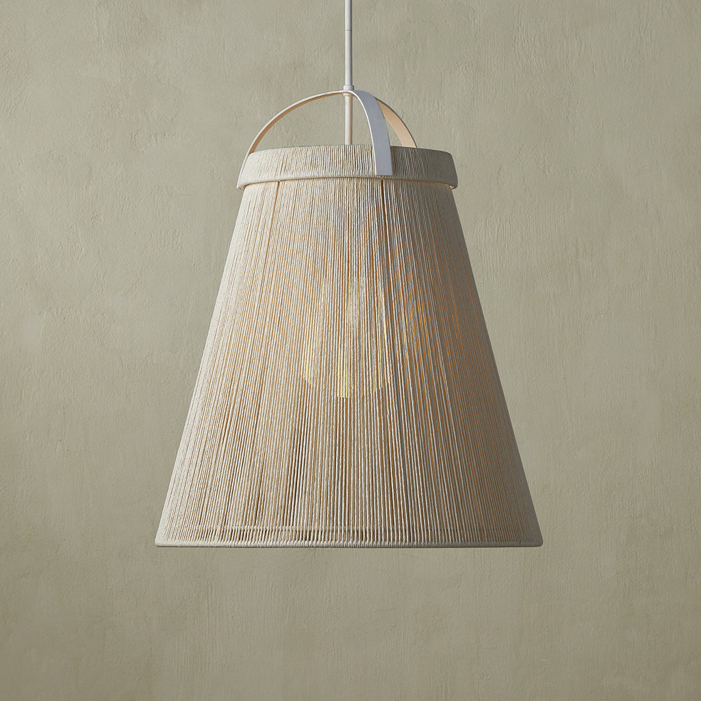 The Currey & Co Parnell Pendant was designed by Clarence Mallari to resemble a large bell, but with a delicate sophistication due to the fineness of the Kraft Paper twine. The string is double-wrapped on both the outside and the inside of the wrought iron in a Gesso White finish. A frosted white glass globe is the finishing touch that allows this pendant to create a lovely glow.