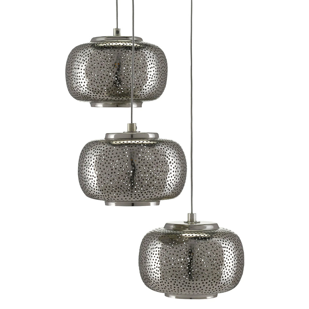 The Currey & Company Pepper 3-Light Multi-Drop pendant has pierced metal shades in a mix of painted silver and nickel finishes. The textural metal orbs are on point for modern farmhouse and industrial chic interiors.