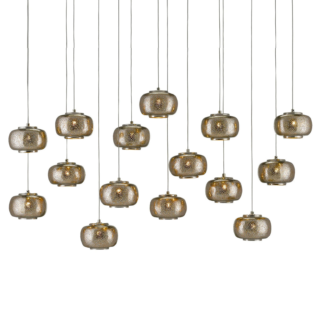 The Currey & Company Pepper Rectangular 15-Light Multi-Drop pendant has pierced metal shades in a mix of painted silver and nickel finishes. The textural metal orbs are on point for modern farmhouse and industrial chic interiors.