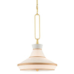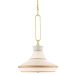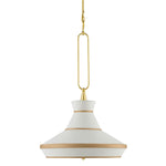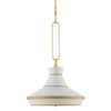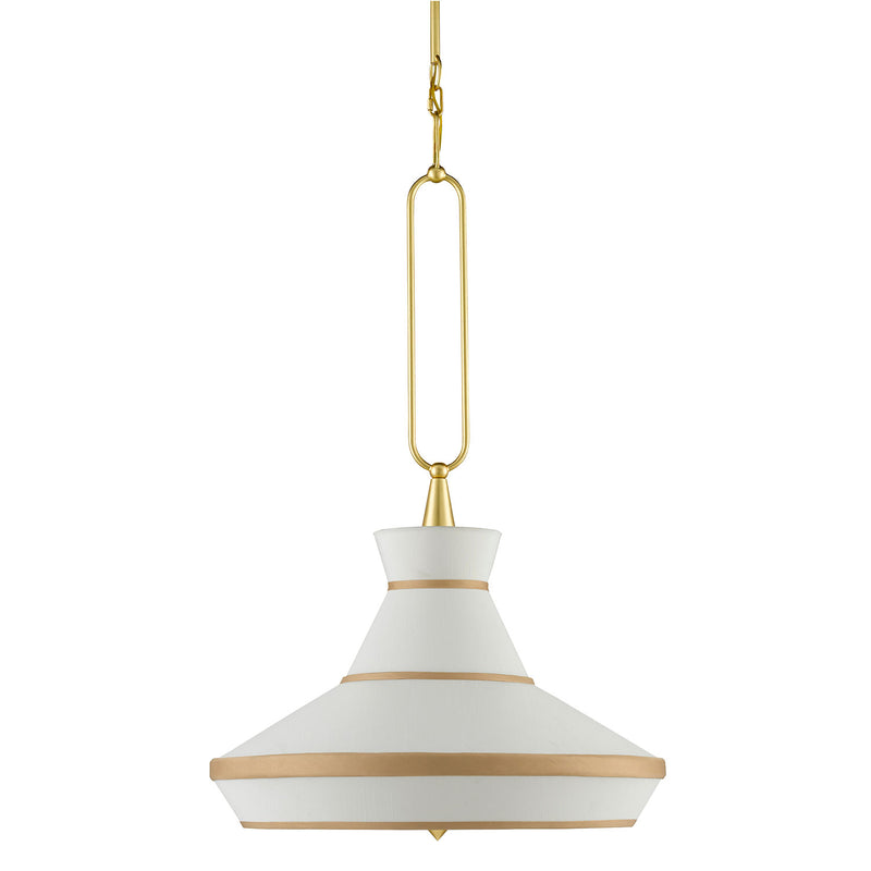 The Currey & Co Perth Pendant is made of metal in a mix of off-white and gold leaf finishes. Ian Thornton designed the gold and off-white pendant to be a new twist on a traditional pendant with a drum shade. Design details of note that he emphasized are the decorative loop and the finessed elements linking to it, the gold trim on the shade, and the acrylic diffuser.