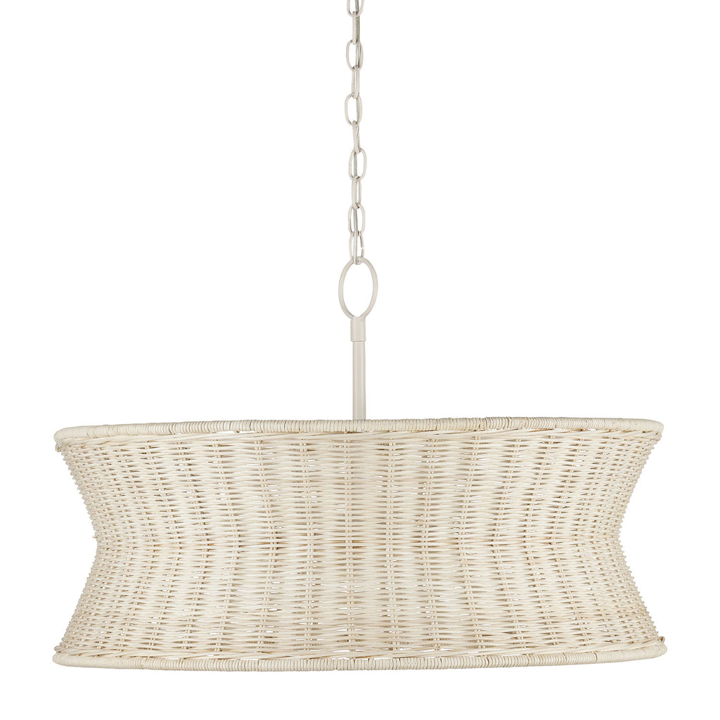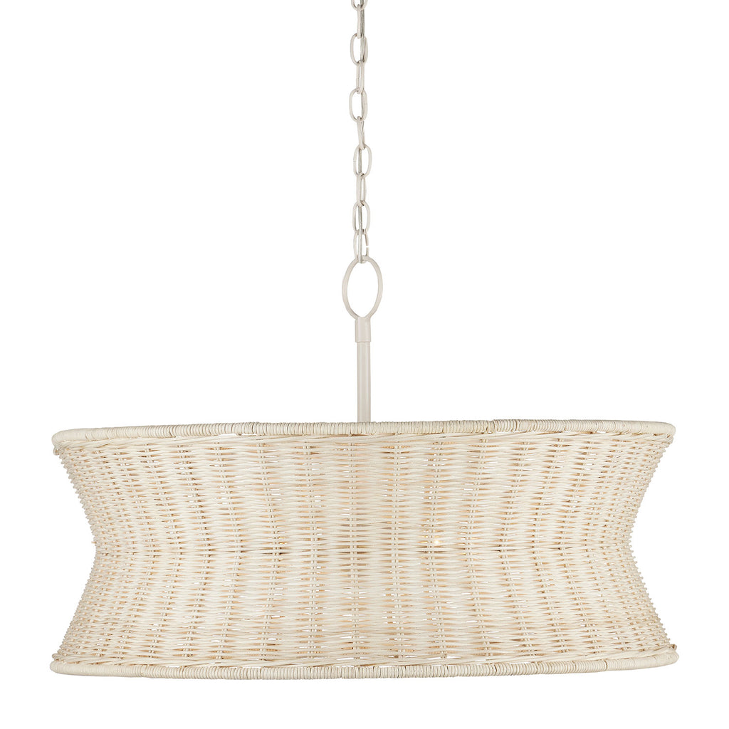 Lightening the profile of the Currey & Co Phebe Chandelier is the vanilla finish on the hardware and the fact that the wicker shade has been bleached. This beige chandelier that illustrates the hallmark of artisanal fixtures was designed by Clarence Mallari, his keen understanding of finely woven natural materials showing in the design.