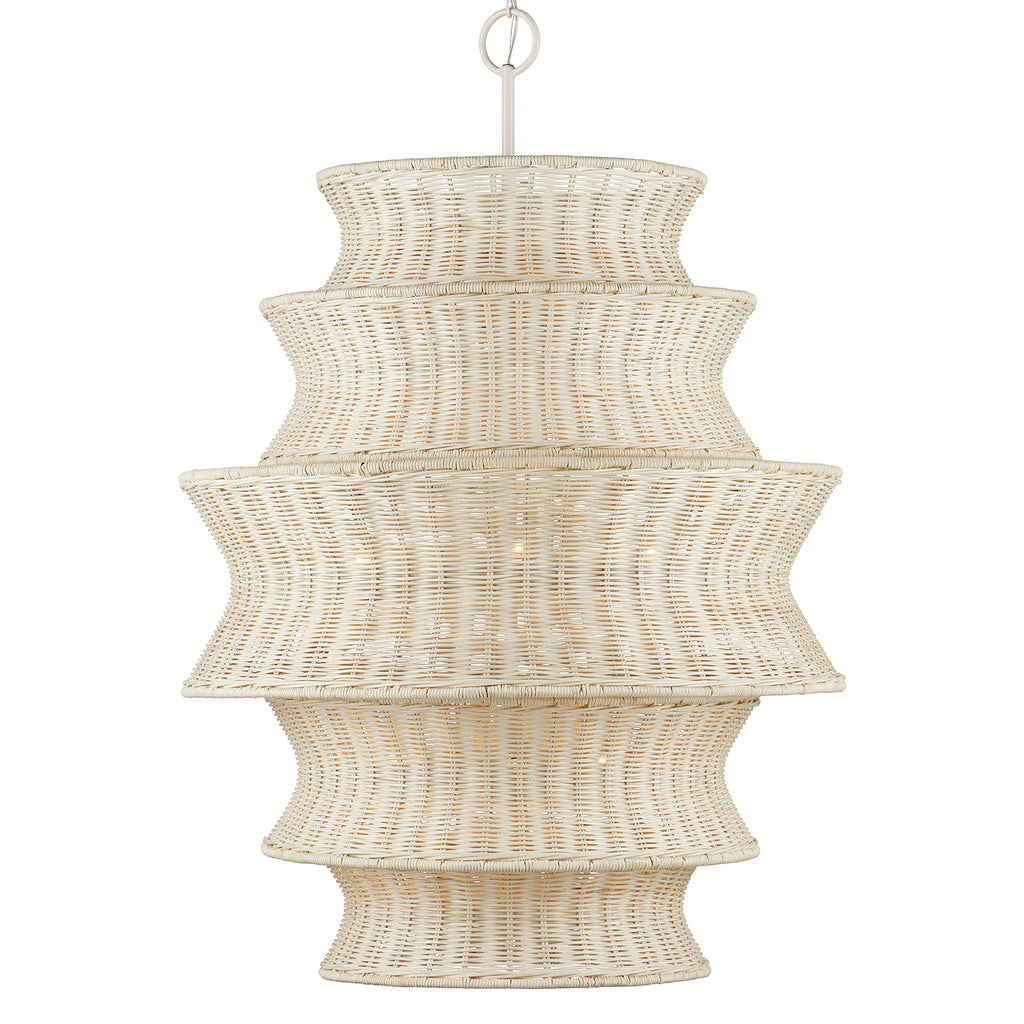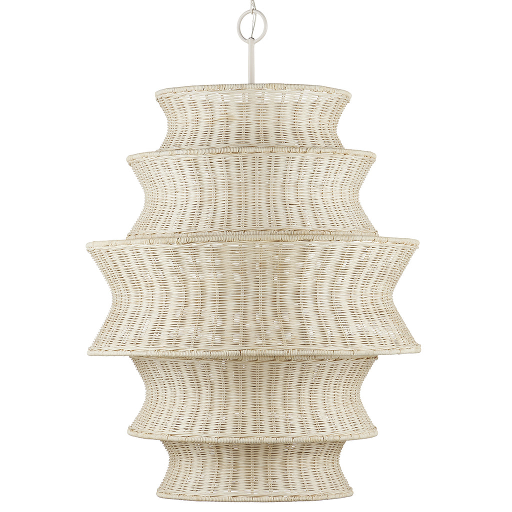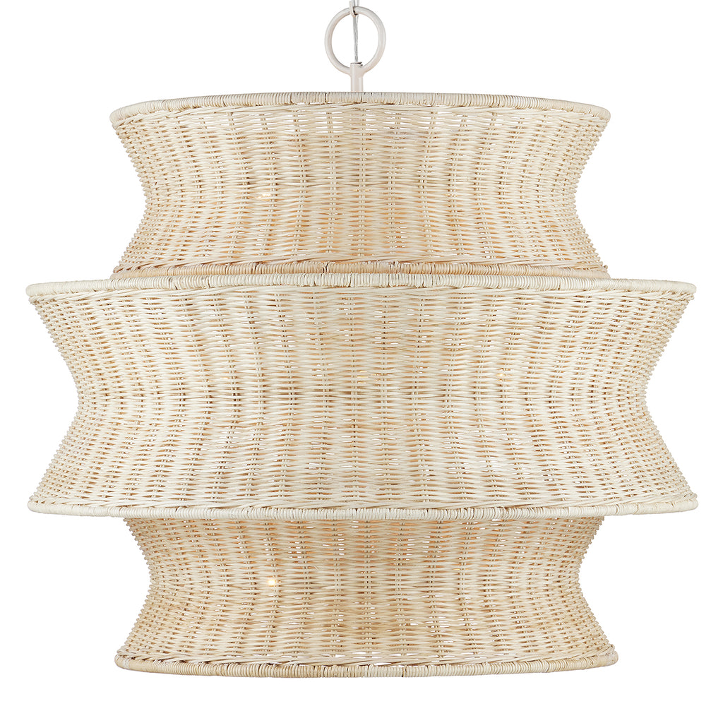 The Phebe Rattan Chandelier is a dynamic design by Clarence Mallari that showcases the talents of our weavers and his own skill at working with natural materials. The three-tier white chandelier has such a cohesive appearance because the circular wire frames are wrapped in the same material, then the entire fixture has been bleached. The vanilla finish of the hardware keeps the design light and airy. Clarence was inspired by a natural material story when he designed the Phebe.