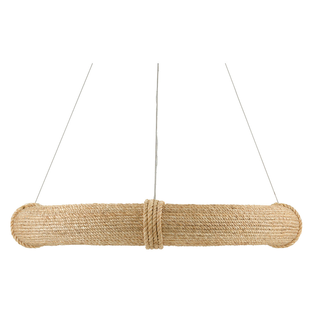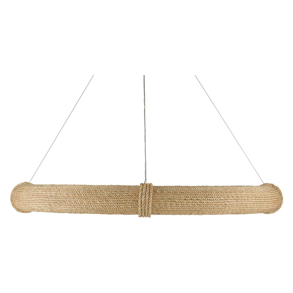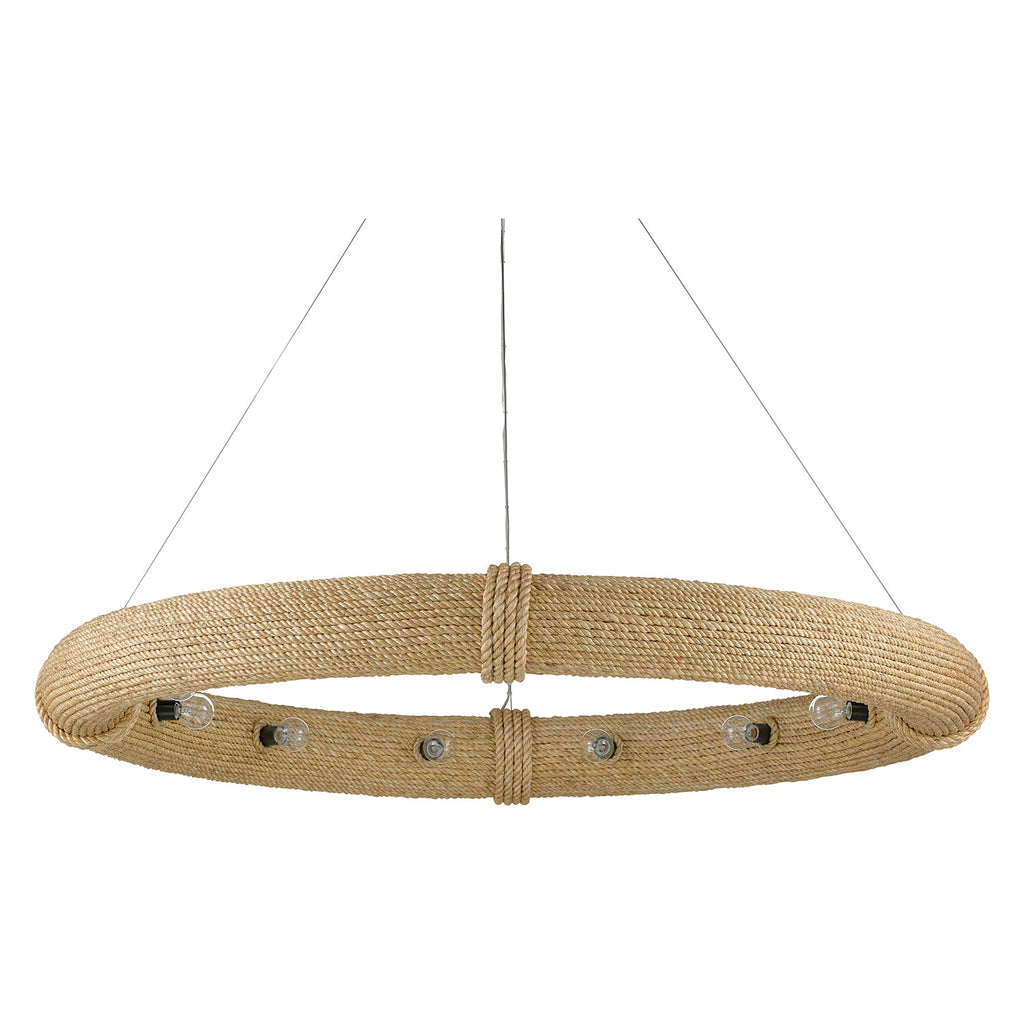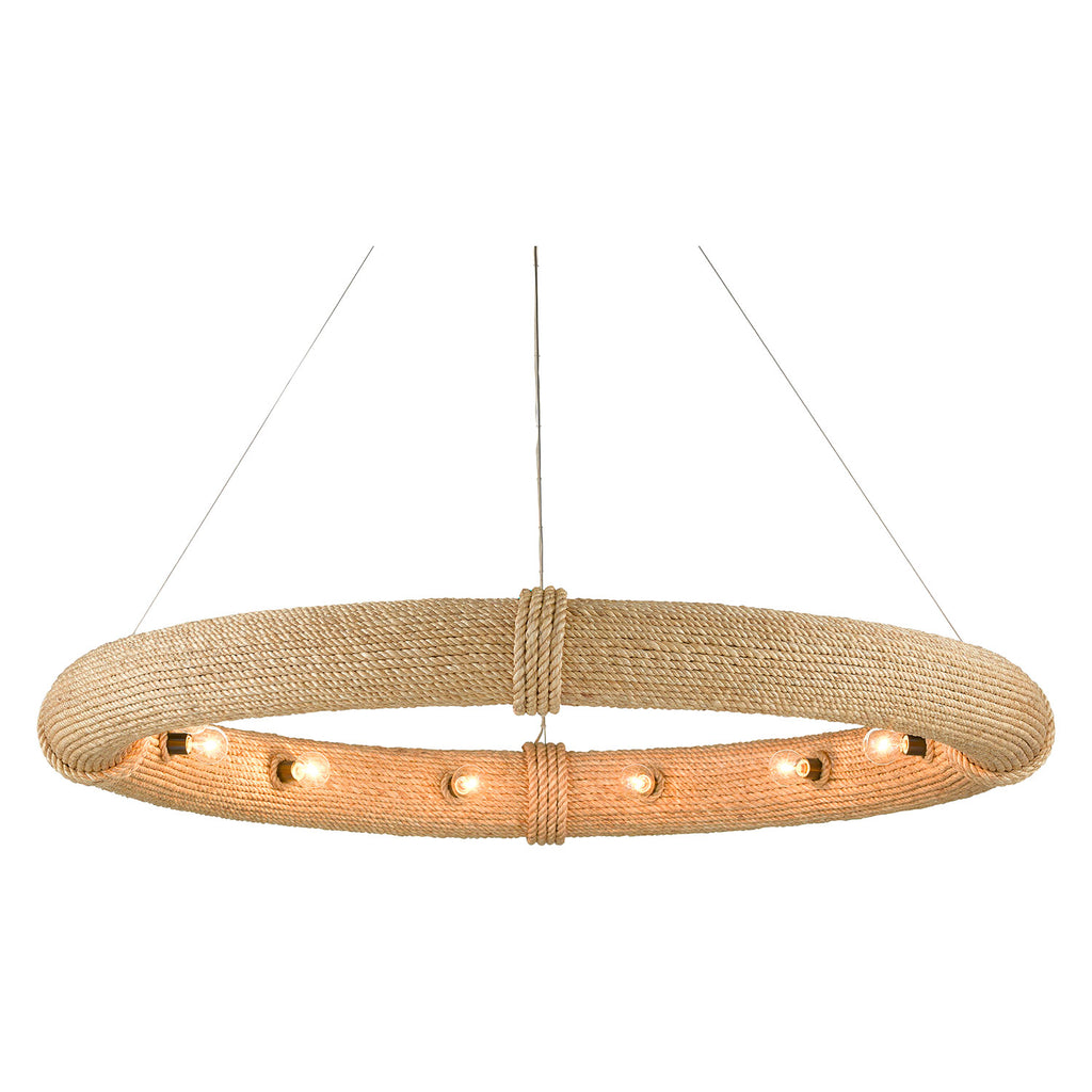 The frame on this Currey & Co Portmeirion Chandelier is made of wrought iron around which abaca rope has been wrapped for the nautical feel that inspired it. This version of the Portmeirion has eight lights, while the larger version has 12 lights, both of which are suspended on an aircraft cable to make the fixtures seem like they are floating in the sea.