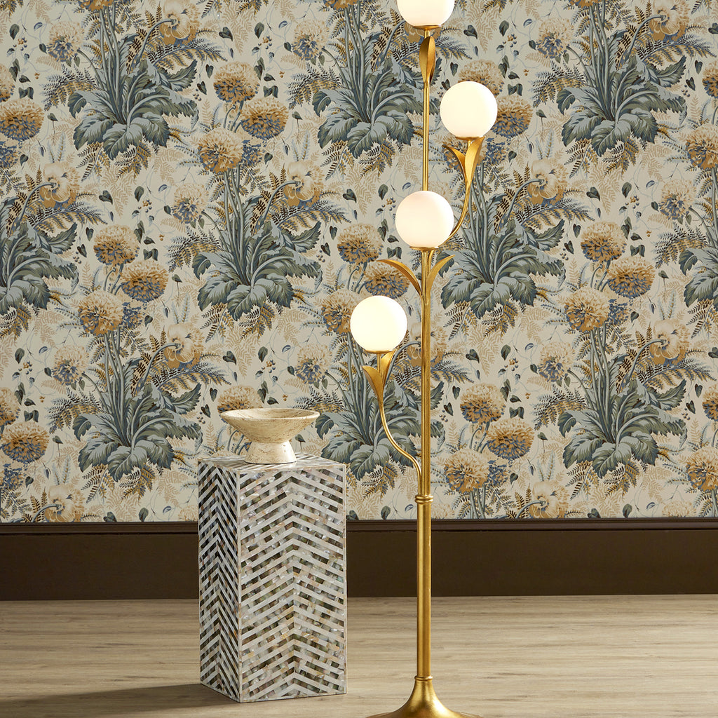 The Currey & Co Rossville Floor Lamp exudes a contemporary retro vibe with its globe-shaped bulbs. This nature-inspired floor lamps is modern in its makeup with the thin arcing leaves that flow along the body and stem of each of the four lights. Made of wrought iron in a contemporary gold leaf finish, the bobeches balance their white glass globes brilliantly.