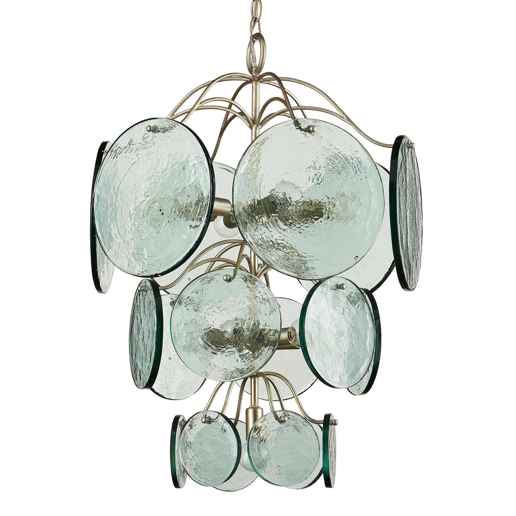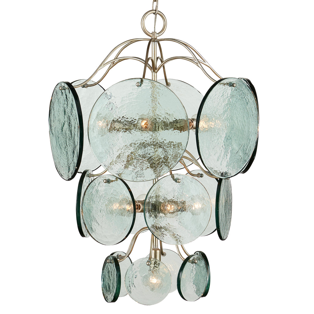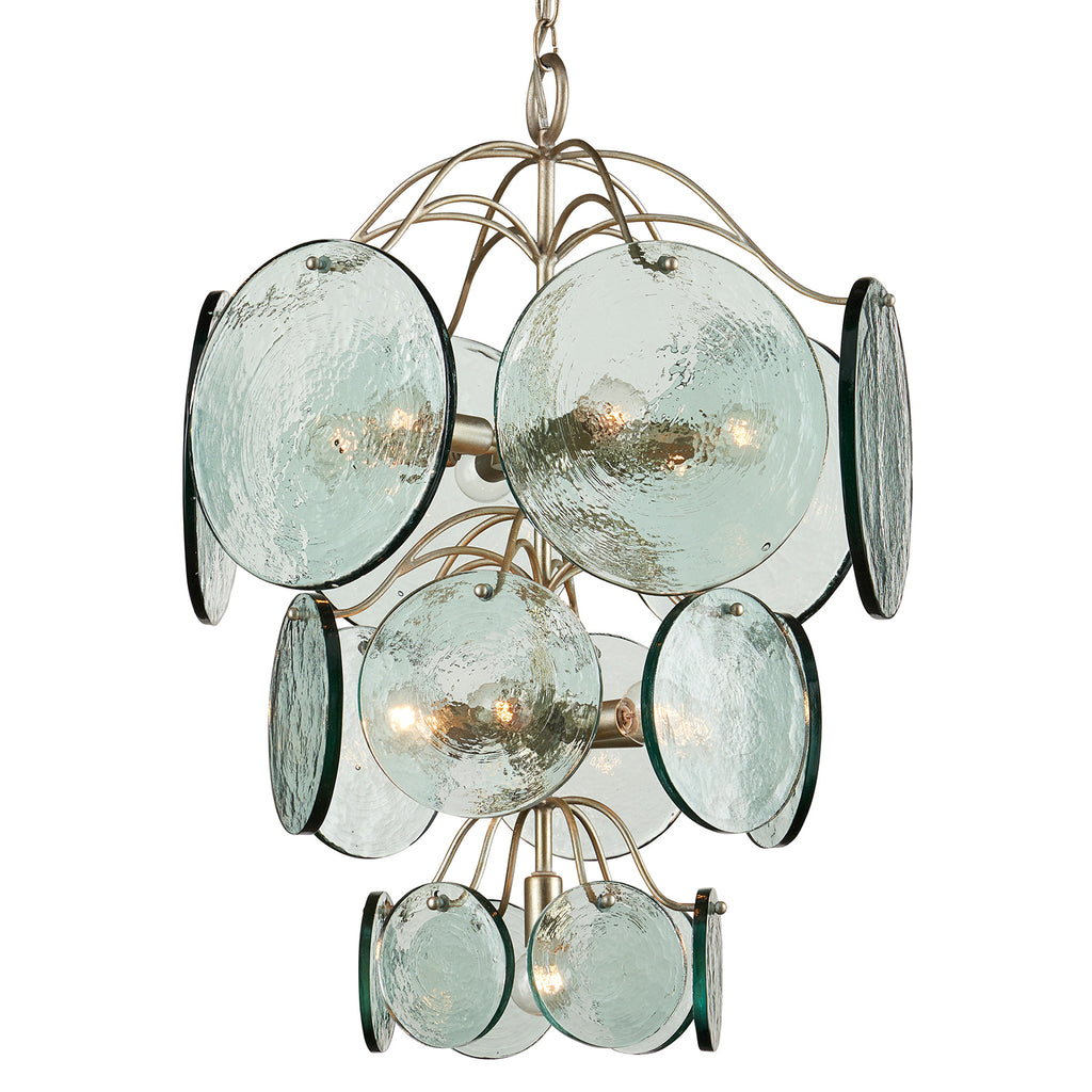 The Currey & Co Rovigo Chandelier has a flowing design created by the wrought iron frame to which discs of recycled glass are attached. The silver leaf finish and the textural mottled glass gleam when the lights are switched on. The silver chandelier has a contemporary feel thanks to the uniform shapes and clean edges of the discs that graduate from larger to smaller as they flow toward the bottom of the fixture.