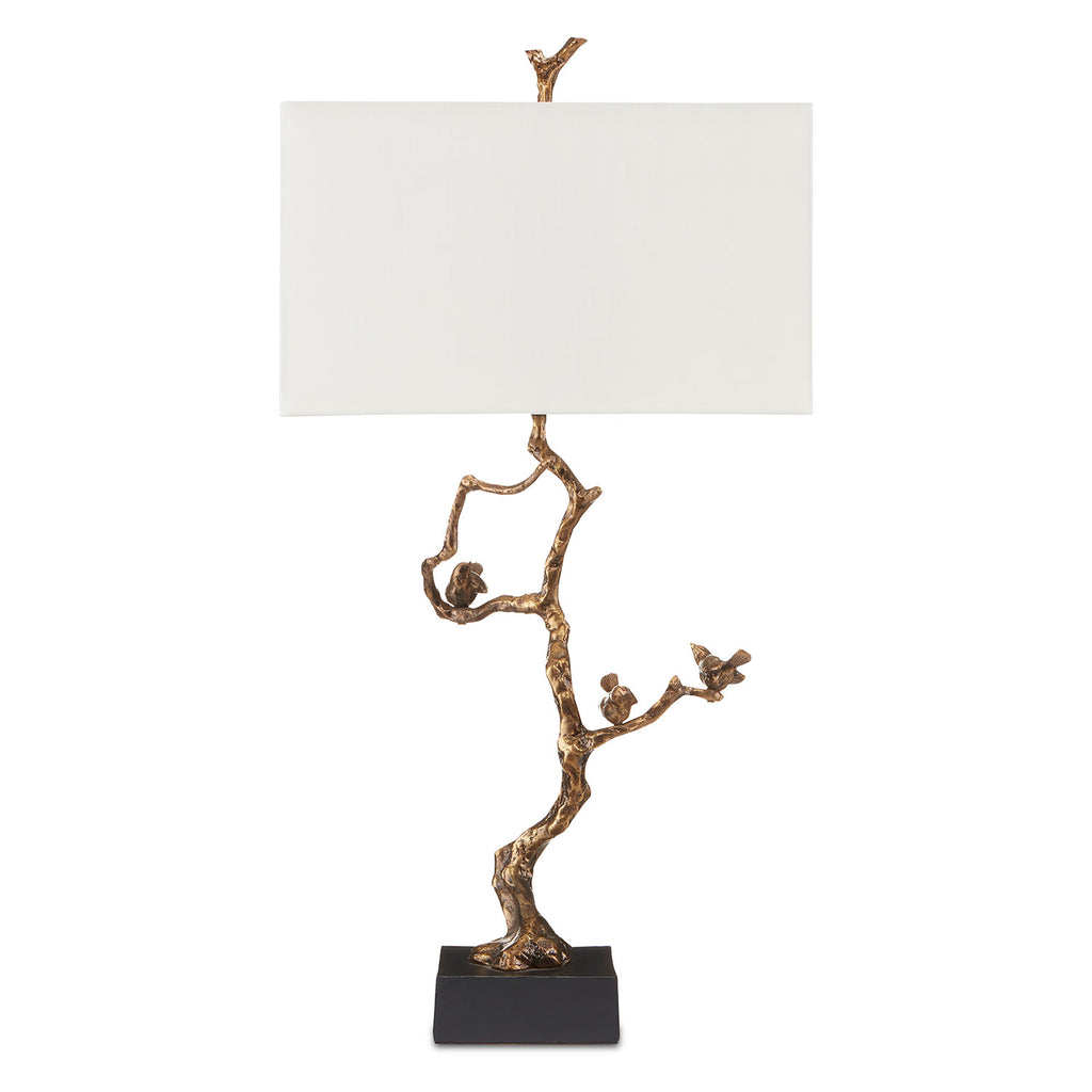 Clarence Mallari designed the Currey & Co Shadows Table Lamp that grows into its story as it disappears under and eclipses the white rectangular shade in a matching finial. "Nature was the main source for my design," Clarence explains. "This table lamp was inspired by twigs." Cast from aluminum in an antique brass finish, the gold lamp sits atop a black marble base.