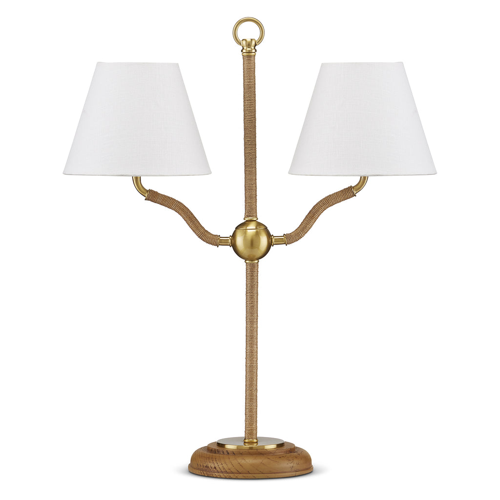 Tom Caldwell created a light profile for the Sirocco Desk Lamp and wrapped all but the main decorative elements in jute rope. These include the ring at its apex, the small globe connecting the forked arms, and the base itself. Made of wood and plated antique brass, the rope desk lamp is fitted with two off-white linen shades. This is a dressy desk lamp that was designed to be a decorative and fucntional accent in a space.