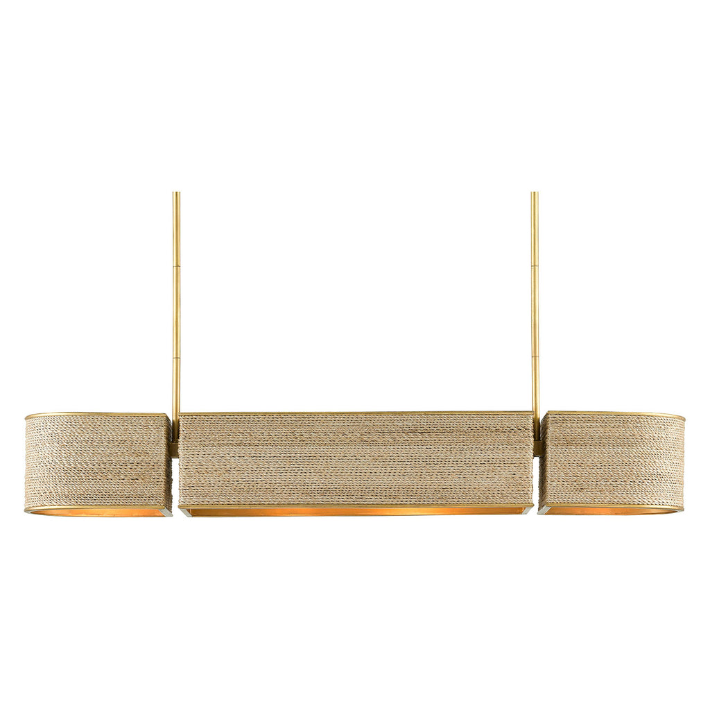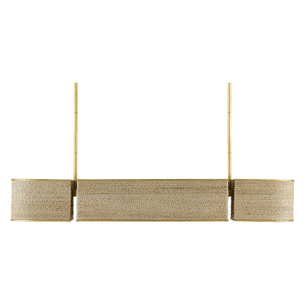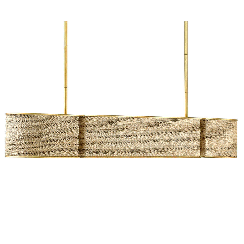 Tom Caldwell says of his design of the Currey & Co Tenby Oval Chandelier, "This rope chandelier was created in a manner that makes it appear to have three floating components. This all-metal construction is covered in a natural rope/twine material and all of the exposed metal is finish in gilded gold. It has a very warm and natural feeling but offers a modern style."