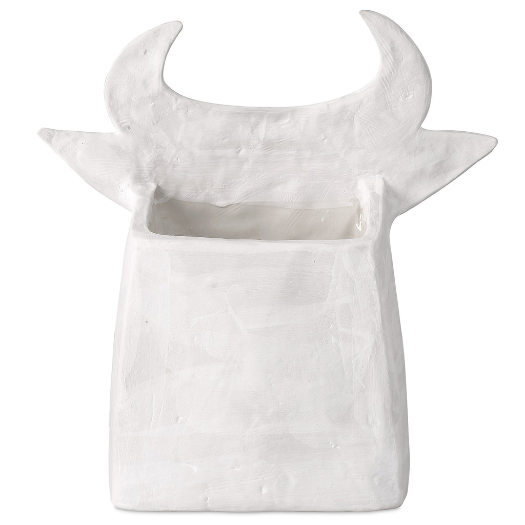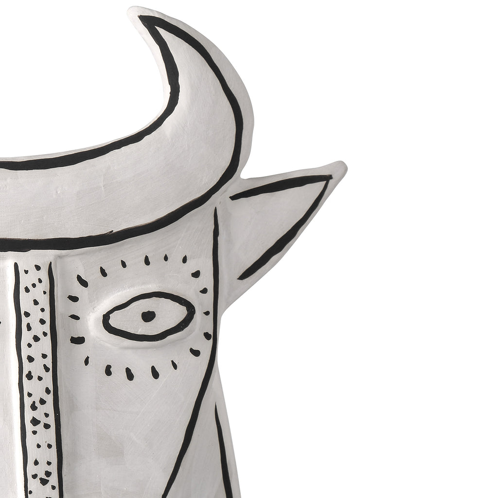 Artist Xiang Yang, a brilliant ceramist, took a walk on the wild side when he created Currey & Co Thomas the Bull. Made of porcelain in a washed-white finish with black whimsical details painted by the artist, the haunting vessel will create a stir not unlike Picasso's work did during his ceramics period as he experimented in the South of France.