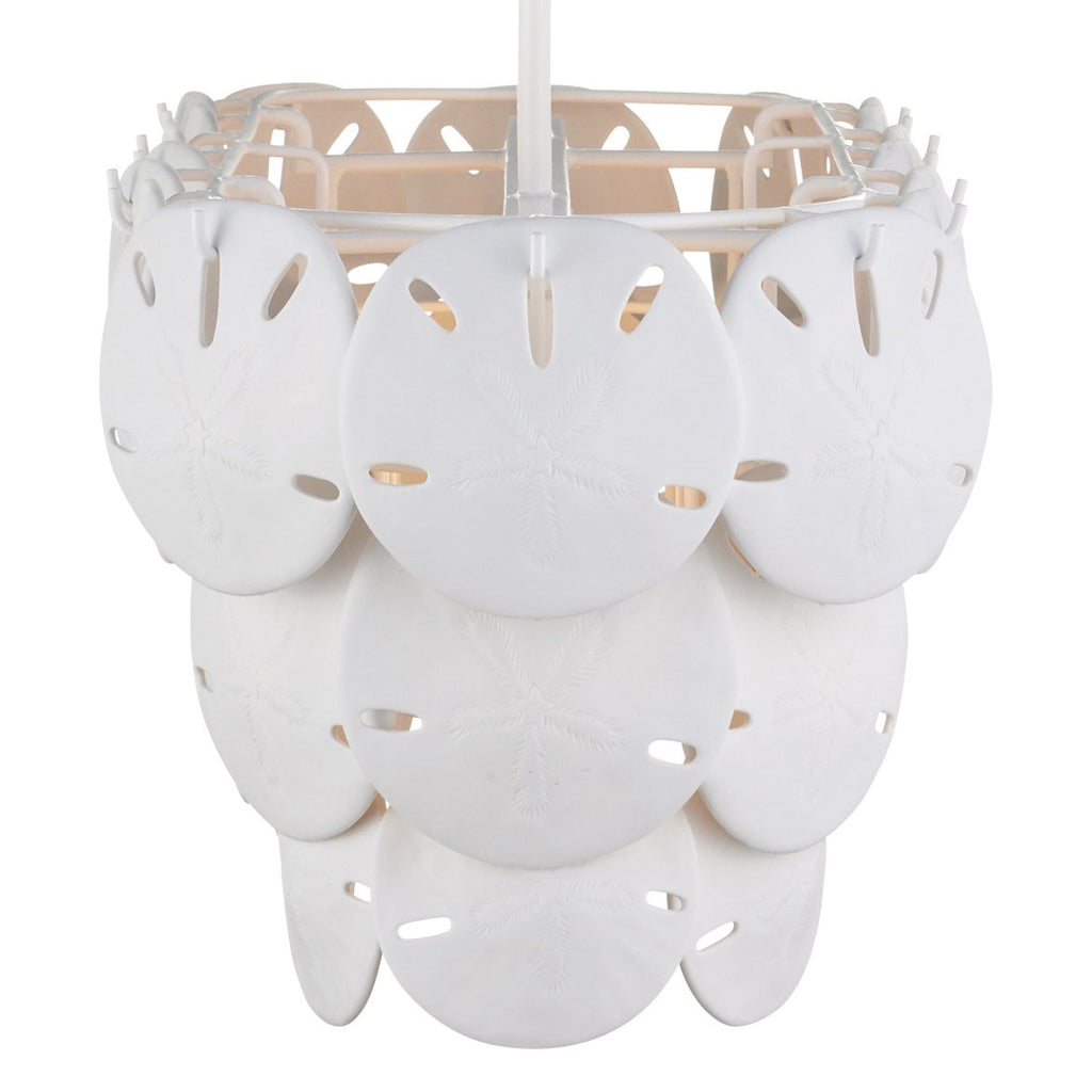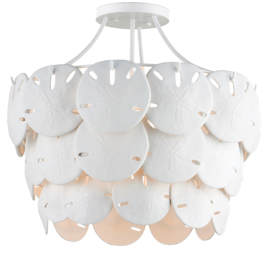 Marjorie Skouras designed the Tulum Oval Chandelier, inspired by the tropical beauty of the Yucatan Peninsula where she lives. This is an elegantly delicate design, as the sand dollars are cast in semi-translucent bone china and they make a pretty sound when a strong breeze ruffles them. There are three sizes of removable sand dollars on this design, which makes it easy to clean. The sugar white finish on the hardware complements the pale discs on this nature-inspired chandelier, making it apropos for rooms overlooking the ocean.