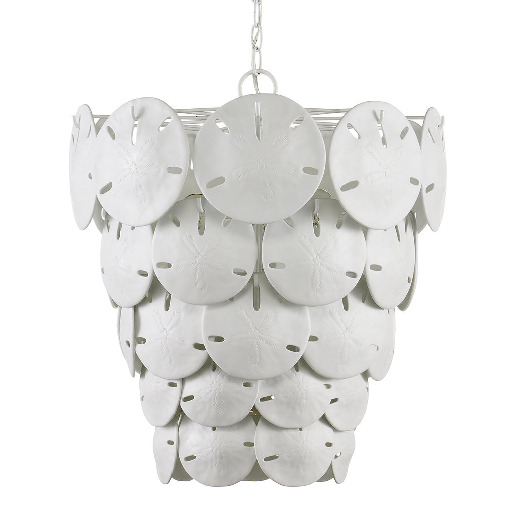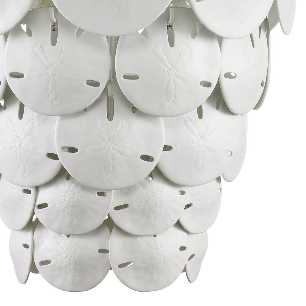 Marjorie Skouras designed the Tulum White Chandelier, inspired by the tropical beauty of the Yucatan Peninsula where she lives. This is a beautifully delicate design, as the sand dollars are cast in semi-translucent bone china and they make a pretty sound when a breeze ruffles them. There are three sizes of removable sand dollars on this design, which makes it easy to clean them. The sugar white finish on the hardware complements the pale discs on this nature-inspired chandelier, making it apropos for rooms overlooking the ocean.
