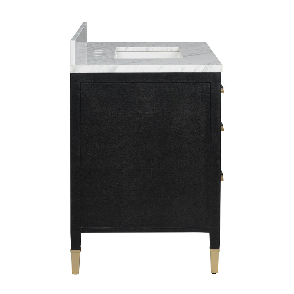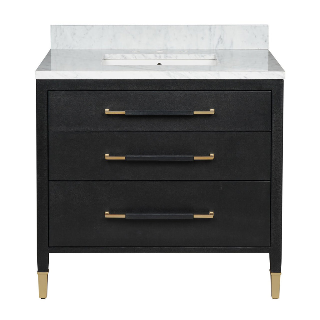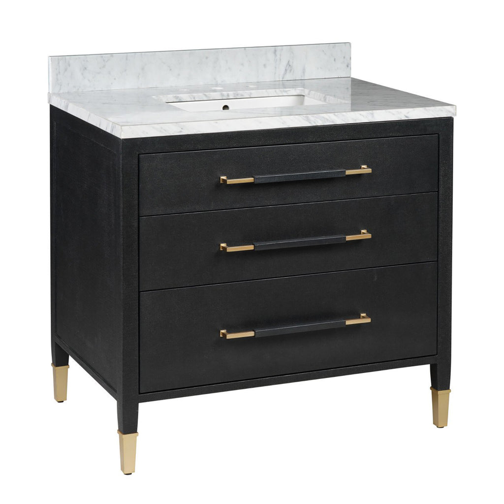 The Verona 36" Linen Vanity is covered in black lacquered linen with metal drawer pulls and ferrules in a champagne finish. The vanity has three working drawers, the middle of which has three removable organizational dividers. The white Carrara marble top is fitted with a white rectangular undermount sink. Other fine design attributes include soft-close door hinges and a matching marble backsplash.