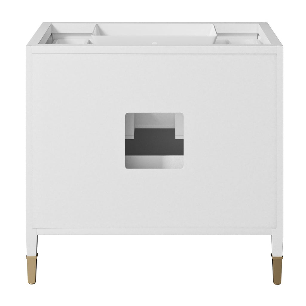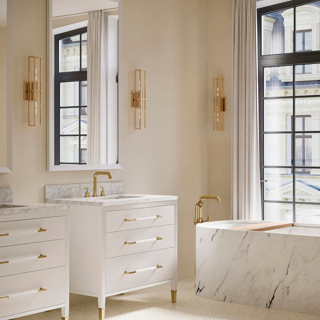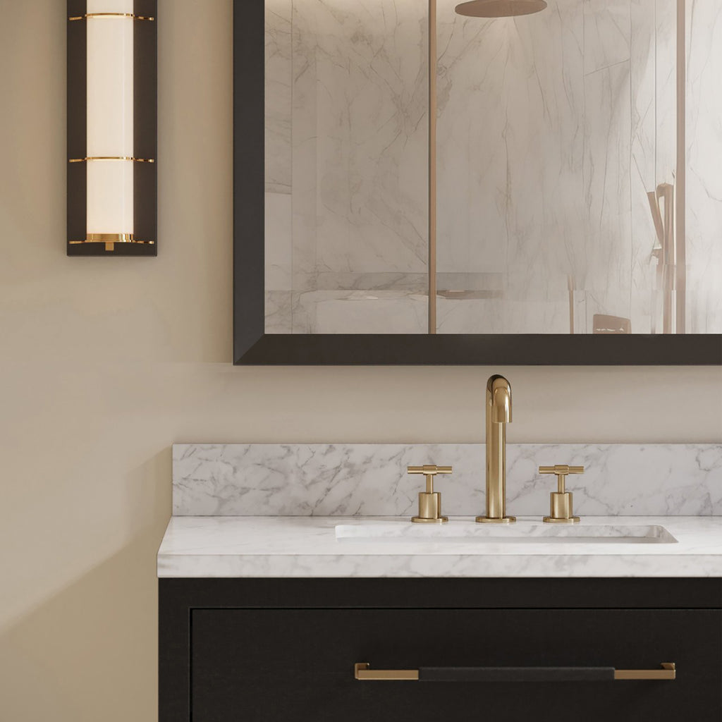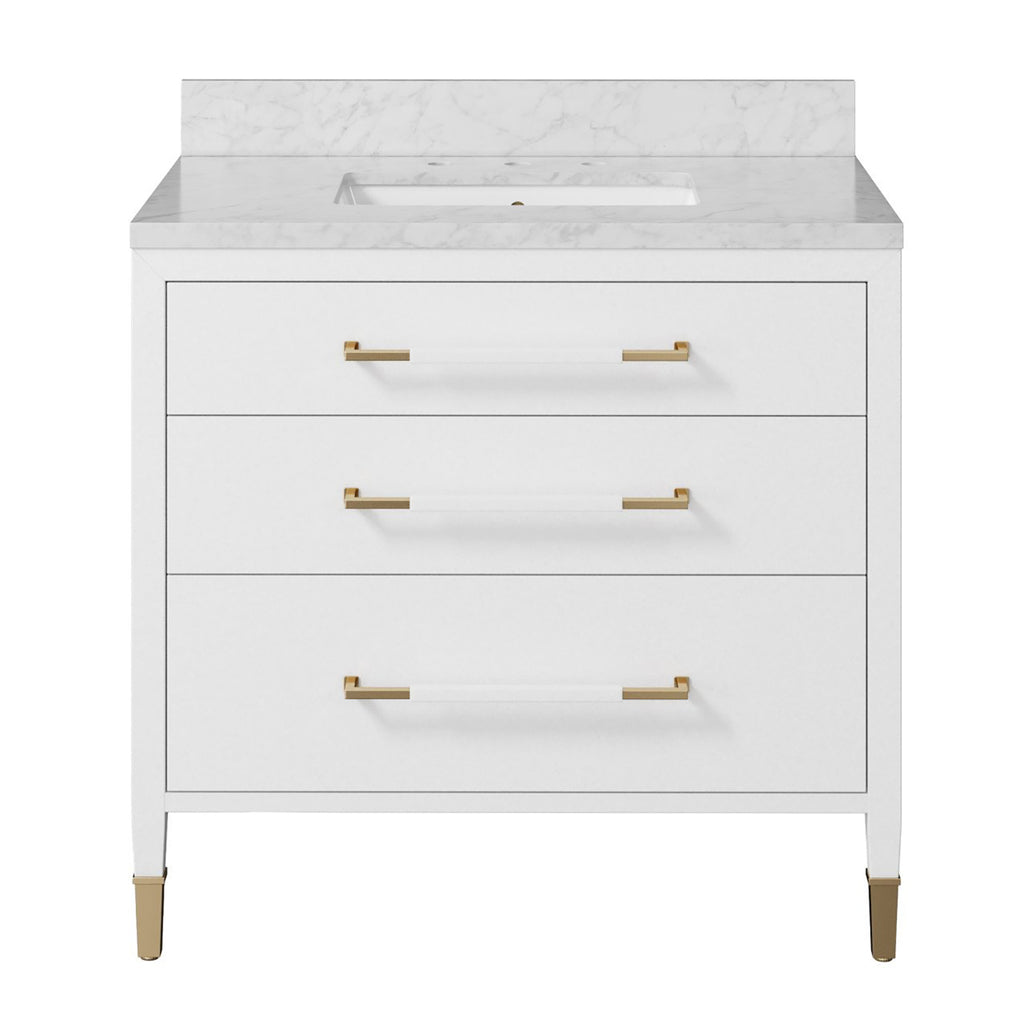 The Verona 36" Linen Vanity is covered in black lacquered linen with metal drawer pulls and ferrules in a champagne finish. The vanity has three working drawers, the middle of which has three removable organizational dividers. The white Carrara marble top is fitted with a white rectangular undermount sink. Other fine design attributes include soft-close door hinges and a matching marble backsplash.