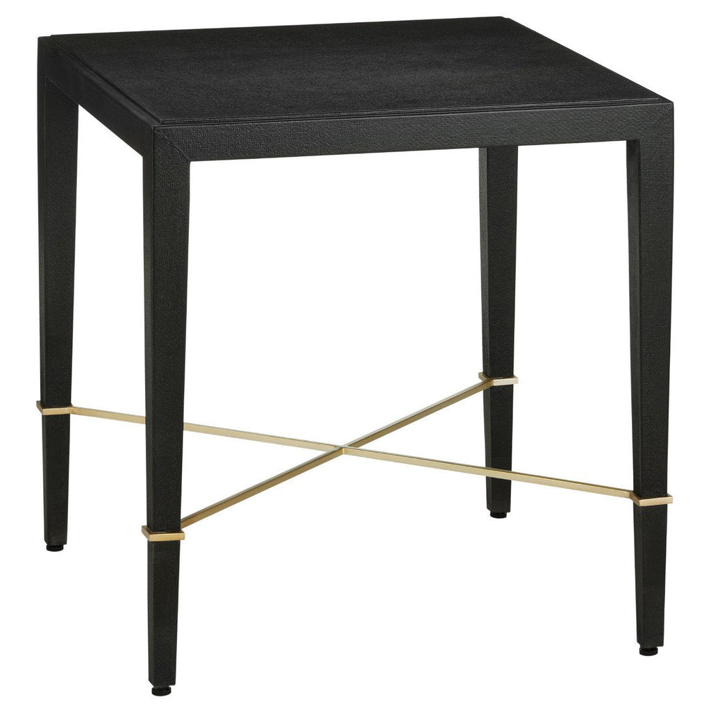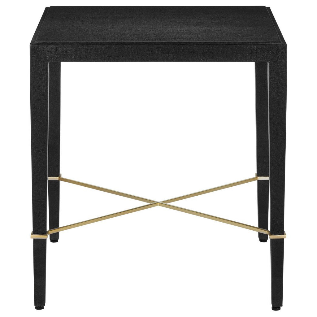 The Verona Black Linen End Table is darkly handsome covered in black lacquered linen that gives the overall surfaces of the table a subtle texture. The zig-zagging stretchers on this minimalist piece, in a champagne finish, bring the black accent table its flair. Design details that make it special are the slight indention surrounding the edge of its top and the way the legs tapper slightly as they move toward the floor.