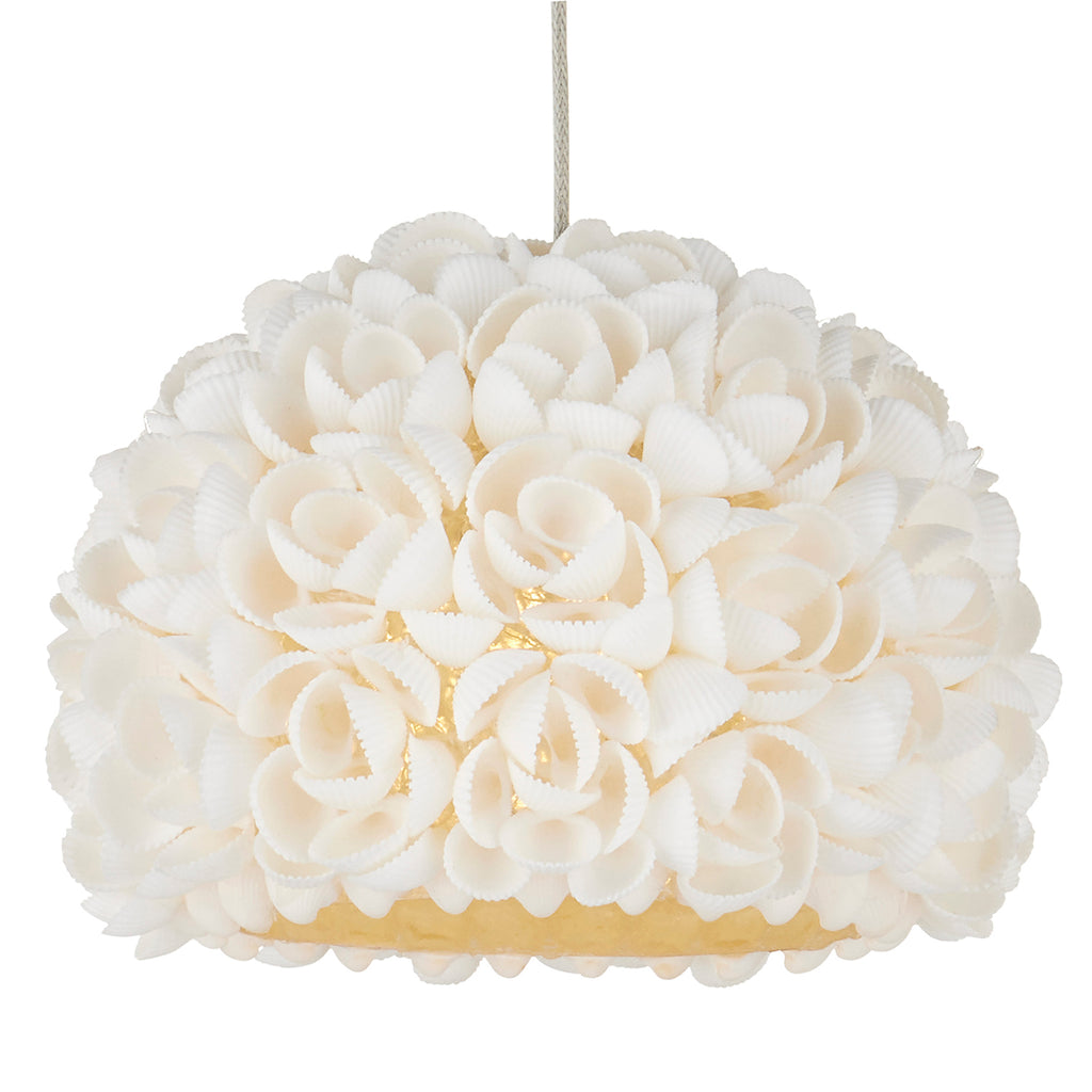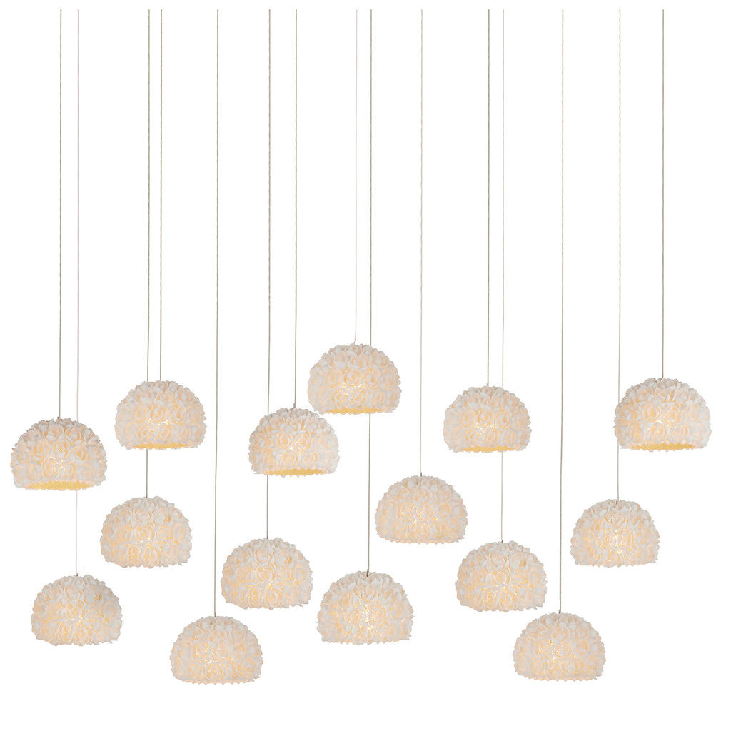 The Currey & Co Virtu 15-Light Rectangular Multi-Drop Pendant has beautifully composed shades around which clamrose shells are fashioned to look like rosebuds; each petal hand-placed to make this an artisanal offering. The way the illumination wafts through the shade and surrounds the shells is a design detail of note with this lovely nature-inspired luminary.
