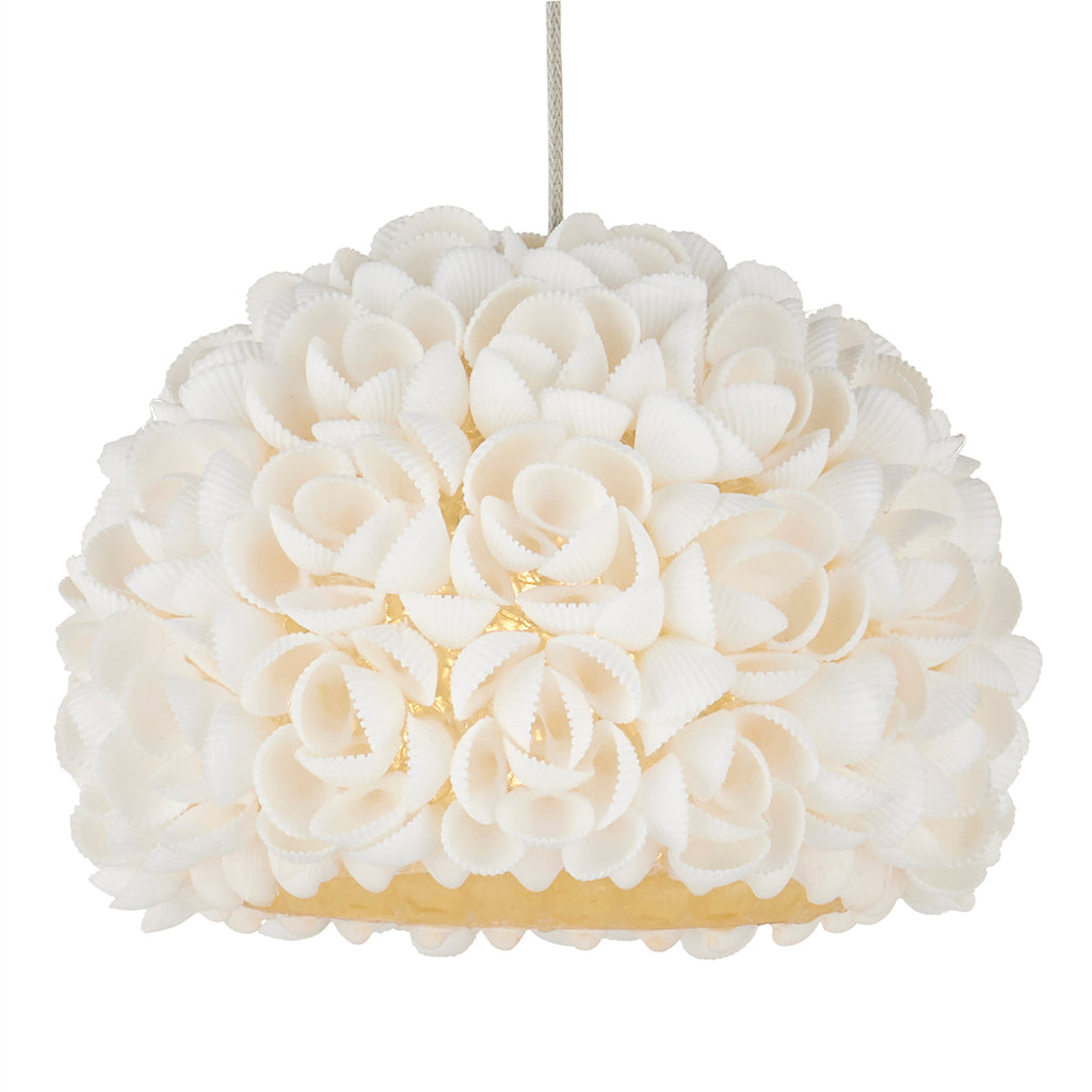 The Currey & Co Virtu 30-Light Rectangular Multi-Drop Pendant has beautifully composed shades around which clamrose shells are fashioned to look like rosebuds; each petal hand-placed to make this an artisanal offering. The way the illumination wafts through the shade and surrounds the shells is a design detail of note with this lovely nature-inspired luminary.