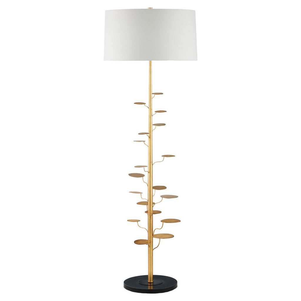The con-temporized leaves that flow around the thin stem of the Currey & Co Vittoria Floor Lamp were inspired by the Chinese money tree. They lift up on their stems as if they are sunning their faces in bright light. Made of metal in an antique gold leaf finish, the winsome profile rises from a disc-shaped black base.