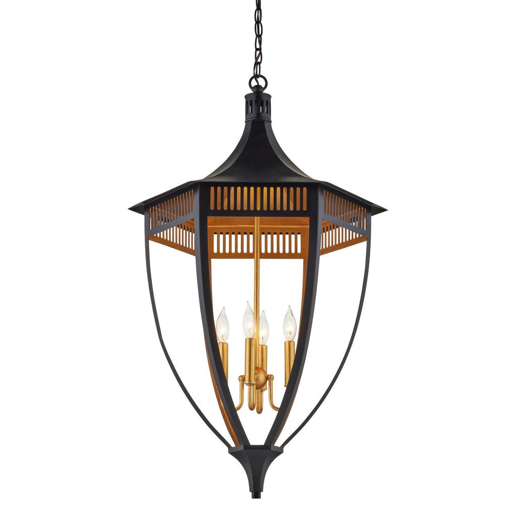 In the Bunny Williams Collection, the Wycombe Lantern has the classic lines for which this lauded designer is known. Made of wrought iron, the refined lantern is finished in a mix of satin black and contemporary gold leaf finishes. Because the interior of the black lantern is covered with gold leaf, the illumination coming from it will warmly glow. The grillework that runs along its circumference where it meets the domed top is an elegant feature.