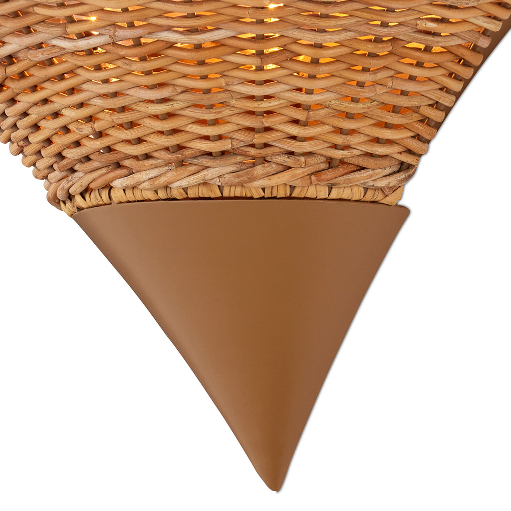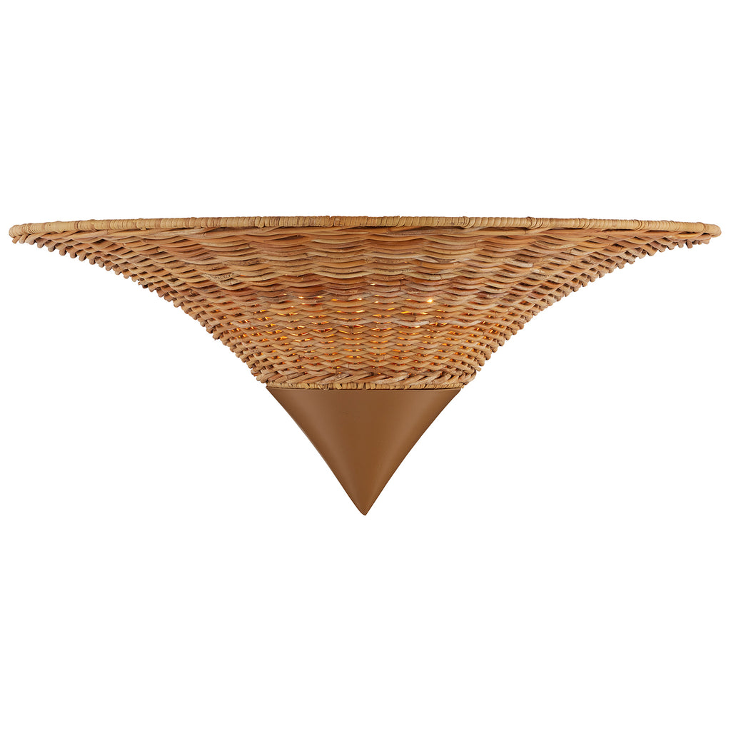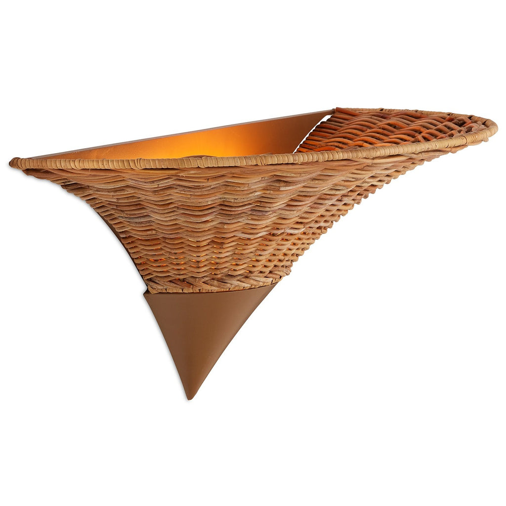 The Currey & Co Zola Wall Sconce is made of beautifully woven natural rattan and wrought iron in a khaki finish. Though it is made of an earthy material, the clean lines of the shape make this a contemporary rattan sconce. The expert weave includes tightly wrapped detailing on the top edge of the sconce and the ring where the rattan meets the metal cap at the bottom. The fixture is fitted with a backplate in the same finish that brings the illumination a warm glow.