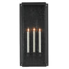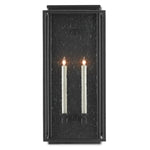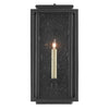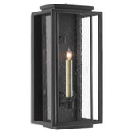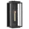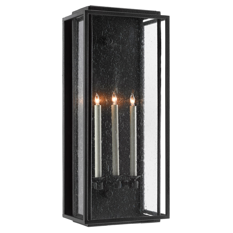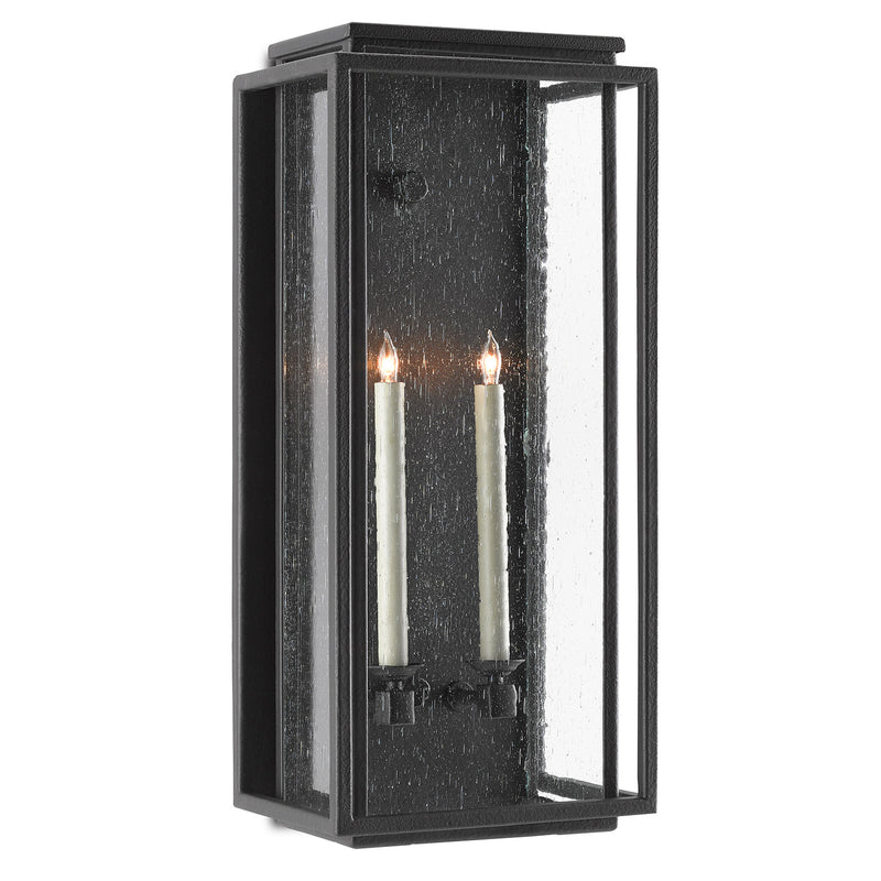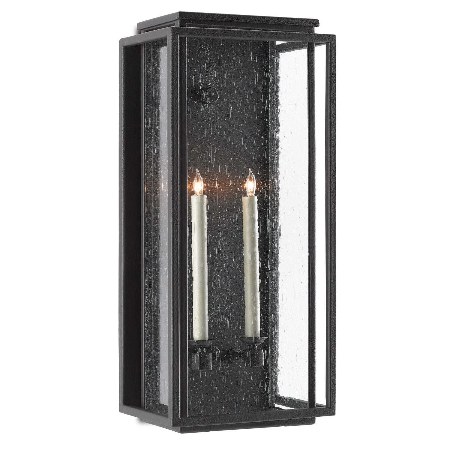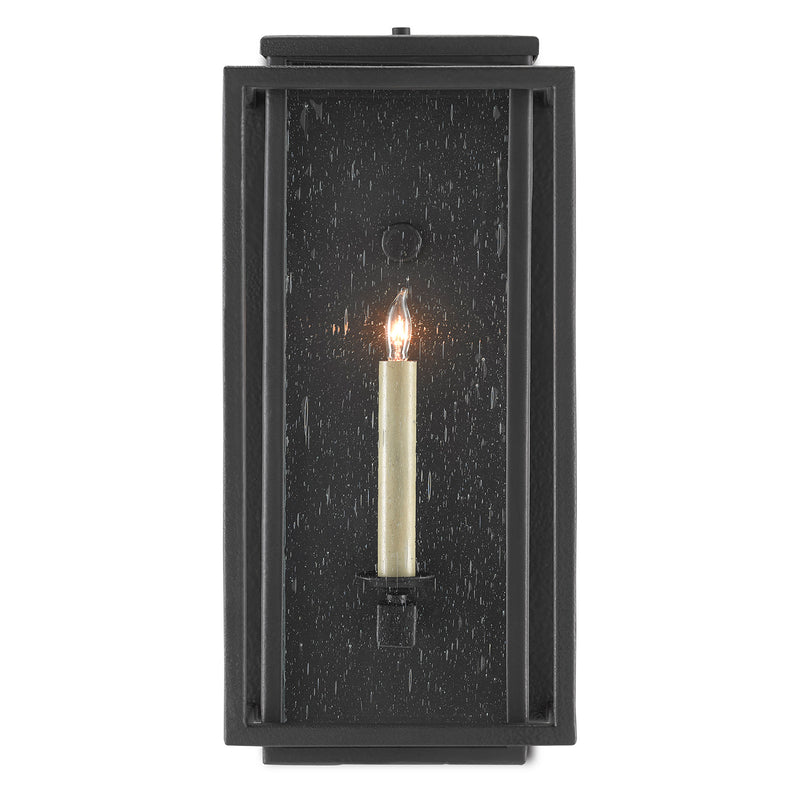 The Currey & Company Wright Outdoor Wall Sconce in the Twelfth Street collection of outdoor lighting. This outdoor wall sconce features a high-performance, weather-resistant Trilux finish that is fade resistant, crack resistant and rust resistant. Currey & Co guarantees the finishes applied to the Twelfth Street pieces for five years. The metal on this black wall sconce in a midnight finish surrounds seeded-glass panes. It is certified for outdoor and damp locations.