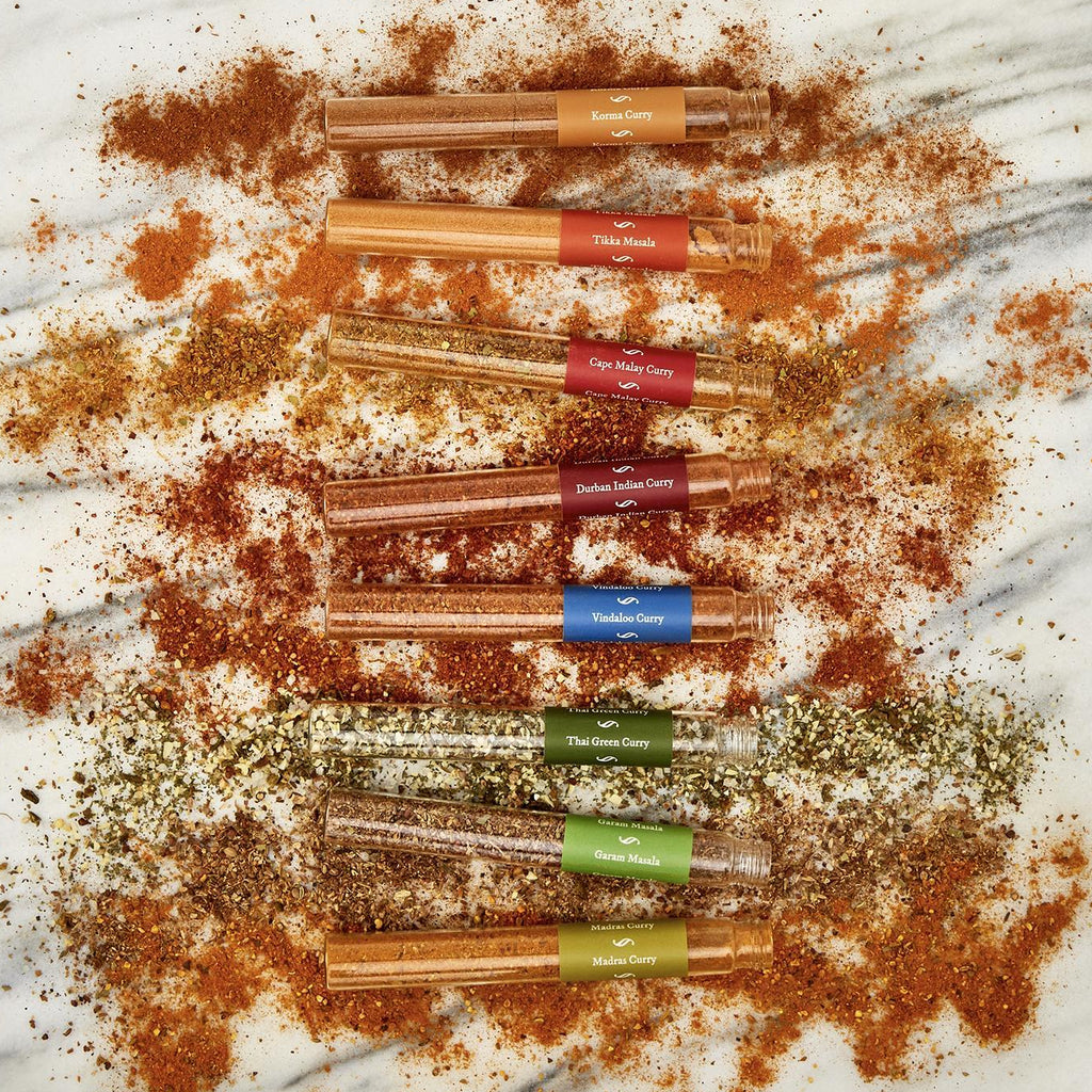 Experience the diverse flavors of global cuisine with the Curries of Origin collection - a tantalizing assortment of 8 curry blends sourced from around the globe, each offering a unique blend of spices, flavors and heat levels to suit every palate. Whether you prefer the creamy richness of Korma Curry or the bold flavors of Cape Malay Curry, there's a curry blend to satisfy every craving. Spice up your meals with aromatic Tikka Masala or transport your taste buds to the streets of South Africa's east coast with the vibrant Durban Indian curry. Delight in the fiery intensity of Vindaloo or savor the fragrant complexity of Thai Green curry. Add depth and warmth to your dishes with the aromatic Garam Masala or embrace the exotic flavors of the old Madras. Each curry blend comes with recipe suggestions to inspire culinary creativity and elevate your home-cooked meals.