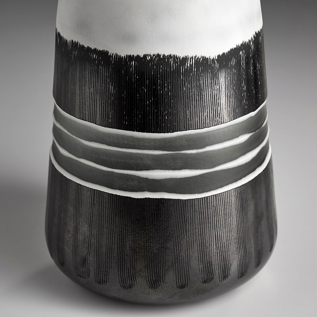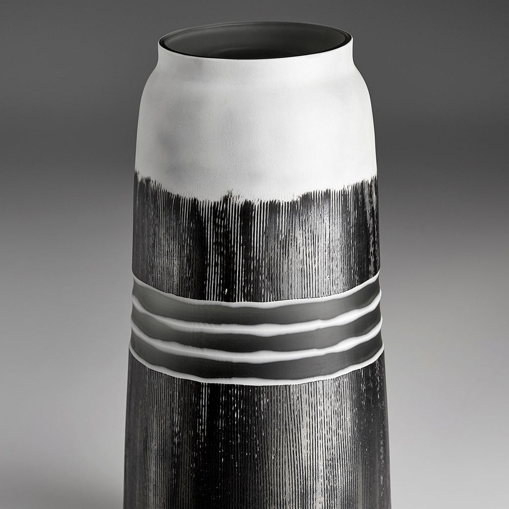 Vases from Cyan Design compliment a bouquet or stand alone on display with distinctive style. These decorative accents add an eclectic feel to contemporary spaces. Made from high-quality hand-blown glass in a two-toned, black and white finish, the Cyan Design Bomeo vase features a three-stripe design spanning horizontally across the surface. Textured brushstrokes liberally cover the majority of this accent piece, adding some artistic elegance to the vessel. A beautiful addition to any decor theme, this vase will surely fill your home with whimsical style and panache. The perfect balance of design, the Bomeo vase is the ideal accessory to anchor a room of any style.