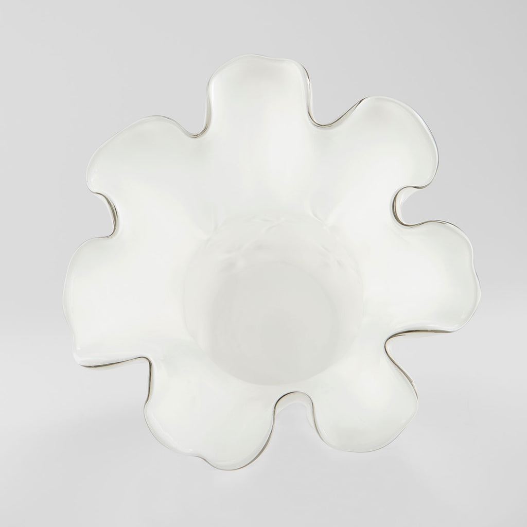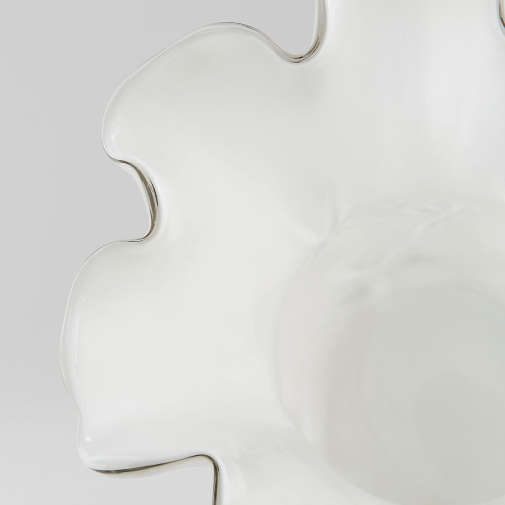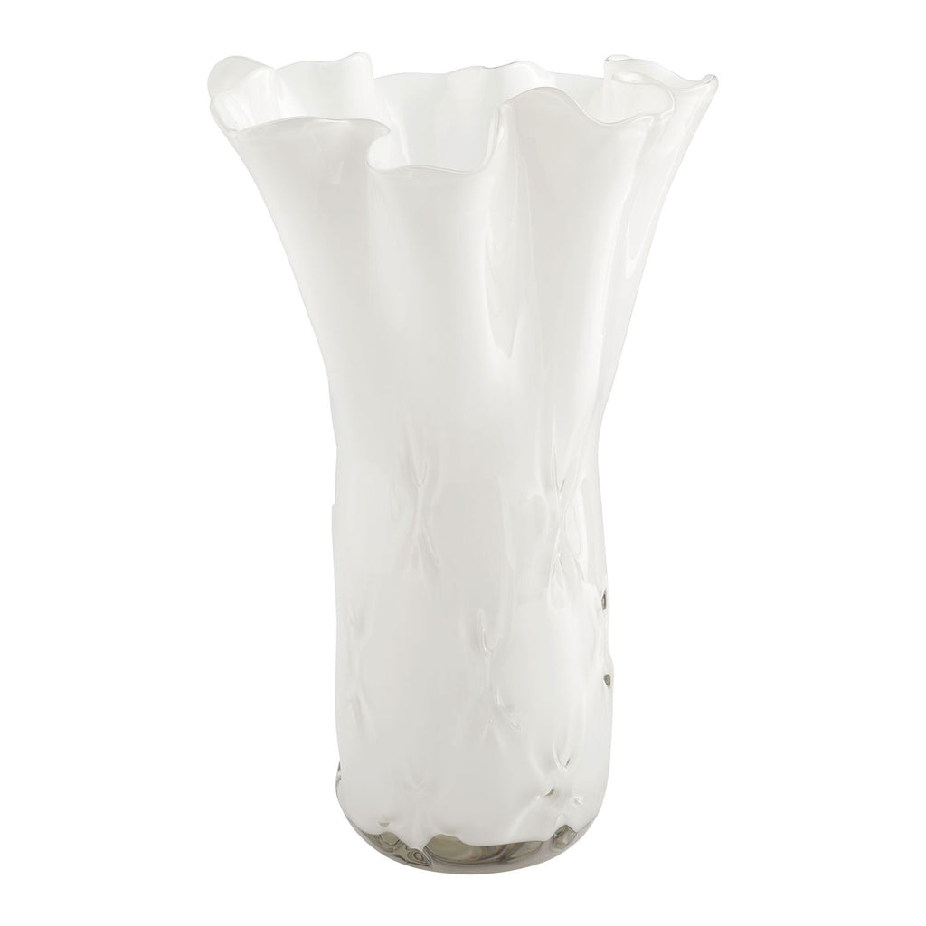 This layered, abstract art glass stands at an eye-catching height on the Cyan Design Bristol vase. Clear glass is blown atop an opaque white or cobalt blue glass core, creating a stunning visual display of a smooth surface with protruding ribbons from top to bottom. Use as a centerpiece in a dining room or start a conversation by placing atop a living area coffee table. Water-tight.