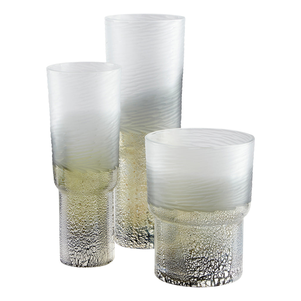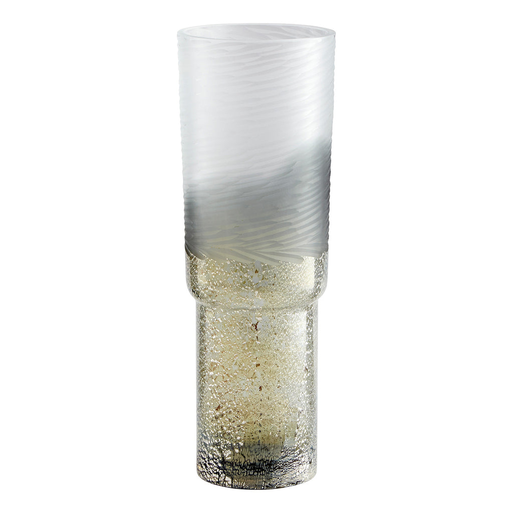 Variance in texture, tone, and size are what make the Cyan Design Canyonland vase standout from the rest. This reverse tulip-silhouette sports a gradient clear to gilded silver surface finish. Transitional versatility offers this vessel a place in any contemporary setting. Adorn your living room, entryway, or commercial lobby display with multiple Canyonland vases (available in three sizes) and top with a floral bouquet for an added natural touch.