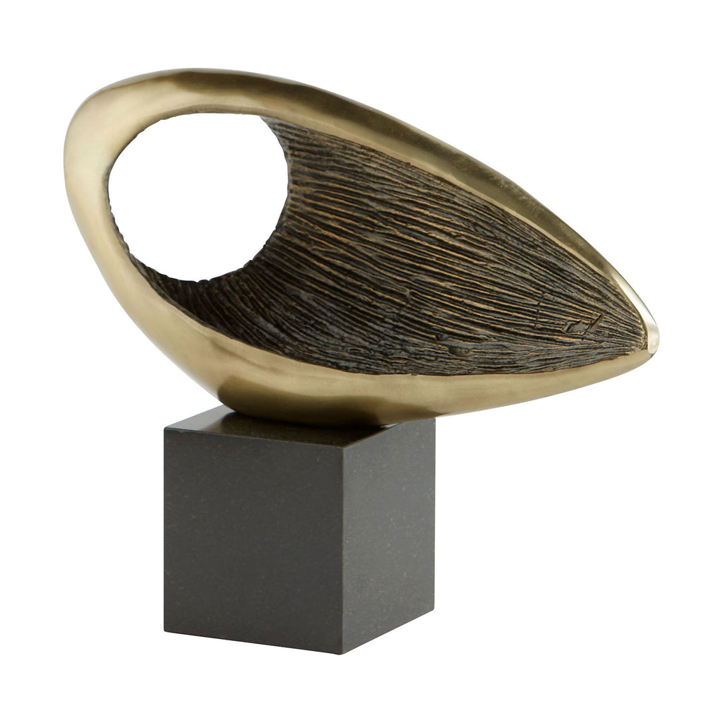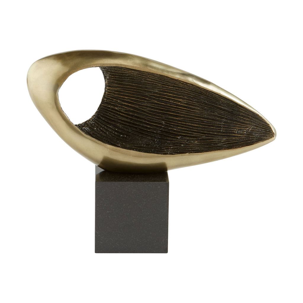 The Cyan Design Delphina sculpture is a smooth abstract adaptation of a tidal wave crashing in on itself. The smooth, calm exterior is contrasted by a raked texture interior. A bronze finish is applied to sand cast iron atop a granite base, keeping the sculpture rooted in elegance with an artistic flair. Place on a bookshelf, side table or console table to inspire meaningful conversation.