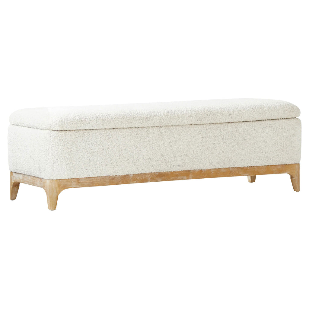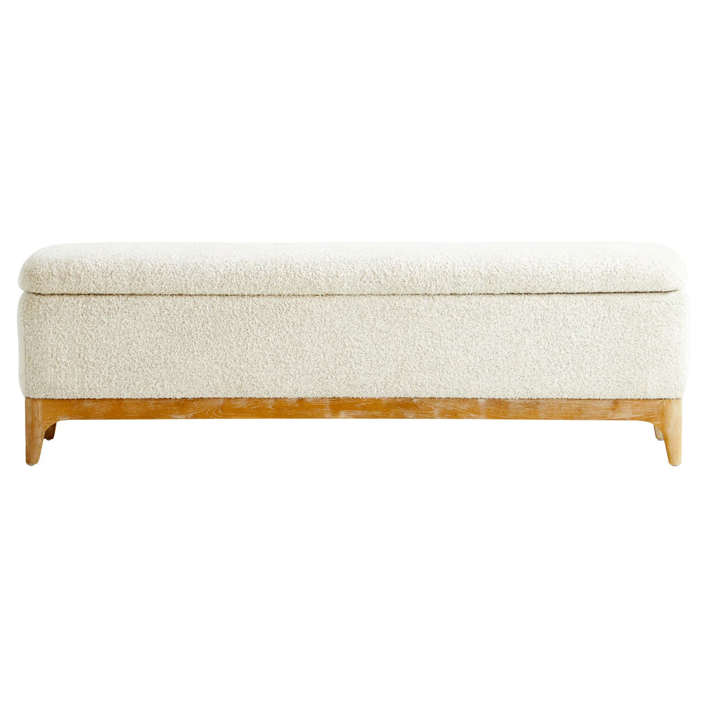 Benches from Cyan Design lend a distinctive, eclectic feel to any home. Add a bench for additional seating and storage, perfect for dining rooms, bedrooms, and hallways. The Cyan Design Diascia bench is an elegant, modern seating option. Finished in a white and grey boucle weave, performance fabric, this accent furnishing is a practical storage solution. It comes equipped with a soft closed hinge that allows the surface top to open at a 45-degree angle. High-density foam filling and a solid wood frame in weathered oak provide comfort and support. Add this as the finishing touch to the entryway, bedroom, or living room to complete your look.